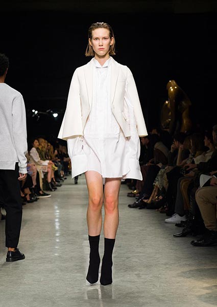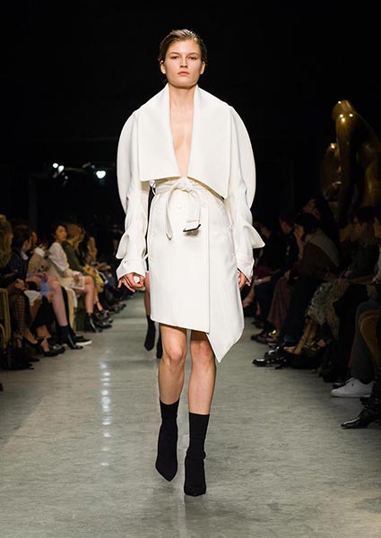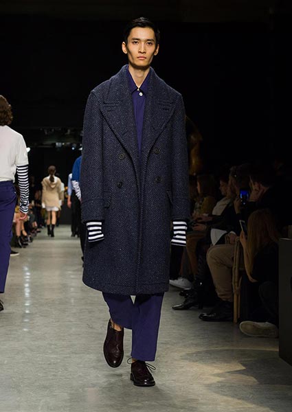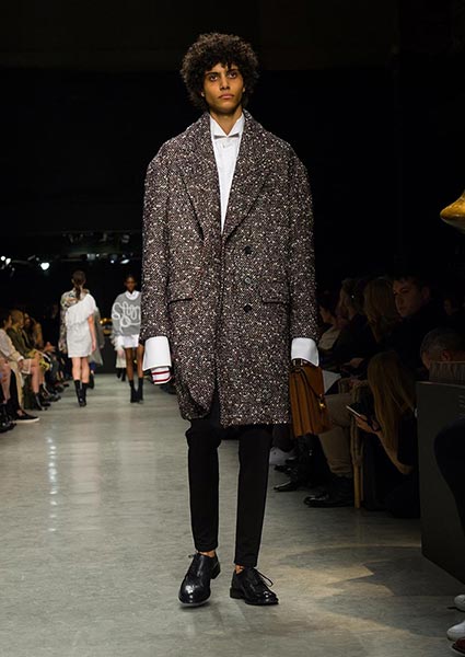 To a soundtrack by British musician Anna Calvi, who performed with the Heritage Orchestra and Choir live from the upstairs space, amid more of Moore’s work, models wove through show venue Makers House in a series of looks that were perhaps unsurprisingly sculptural, asymmetric, deconstructed and wholly celebratory of the artist’s work and personal wardrobe. Sweat shirting fabric and wool were cut together like collages, a cream double-faced wool women’s coat featured a knitted back section, men’s Aran-style sweaters were cropped over shirt tails while one in grey featured a rib-front. The trench was re-imagined with a certain slouch and often also worn over other knitted pieces. Herringbone and tweed was cut as a double-breasted men’s jacket or as an elegant overcoat. Oversized shirtdresses gave off poet vibes; women’s heels featured a Moore-style cutout detail.