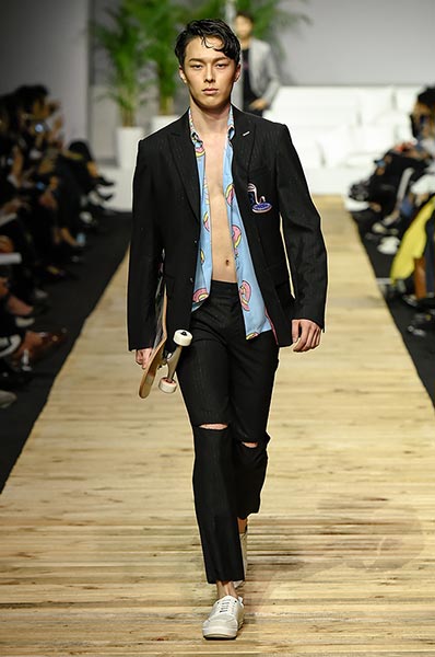 The collections of BEYOND CLOSET are characterised by their youthful, upbeat aesthetic, and for spring 2017, that translated to a fresh take on traditional suiting for a more casual wearer. Staged atop a city building on one of the city’s hottest days, highlights of the collection included slim-cut wool suiting paired with basketball tanks in a unique combination of tailoring and streetwear, with artistic prints created by Golf Wang and additional pieces by Tyler, The Creator, further imbuing the range with an of-the-moment modernity.