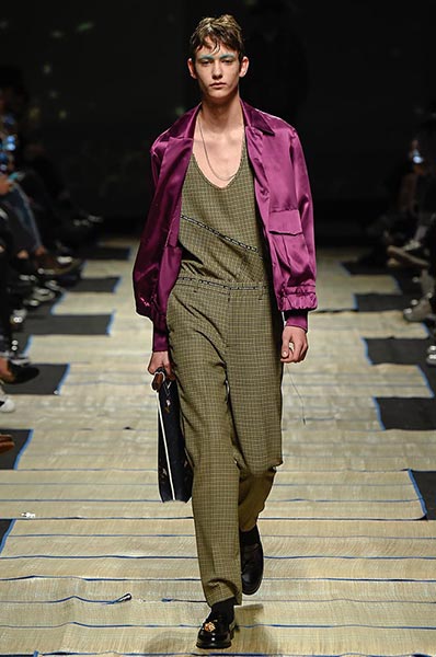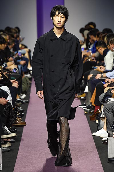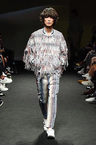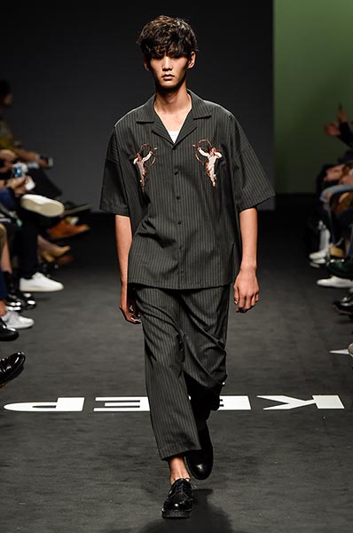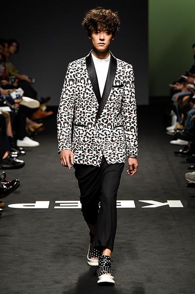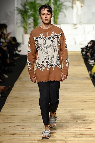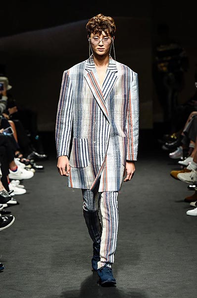 Jarret’s show was one where unique materials and fabric textures stood out, such as silk with an ink-wash painting, rugged wool tweed, and lightweight jacquard. The theme of the collection was explorer novel Le Petit Prince, with the show set against a background of a desert image. With this in mind, an off-the-shoulder one-piece dress evoked a charming explorer, while a striped one-piece dress and skirt brought to mind an urban traveller. With the addition of streetwear, such as tracksuits and zip-up hoodies, the designer ensured this collection remained in tune with the times.