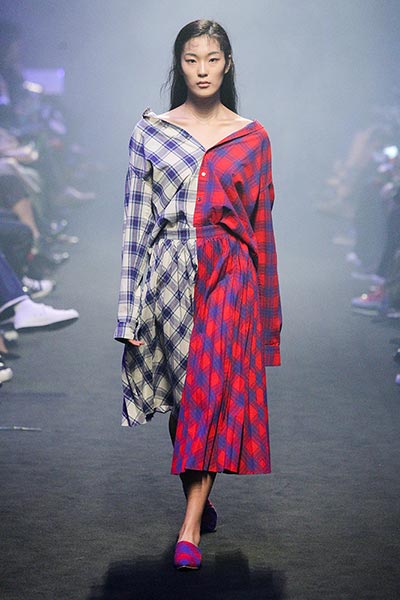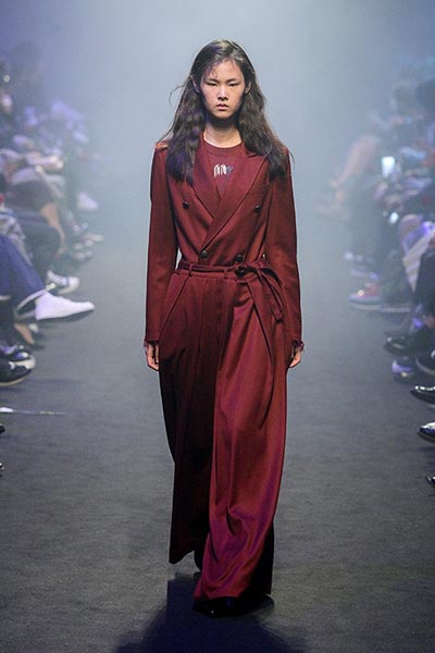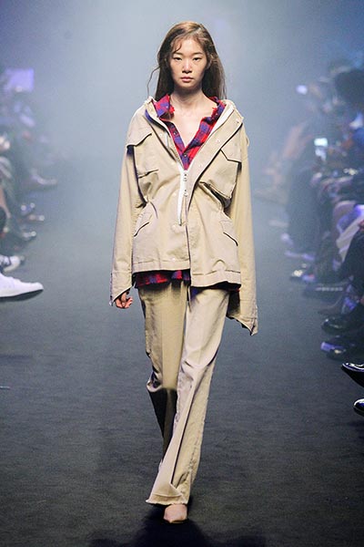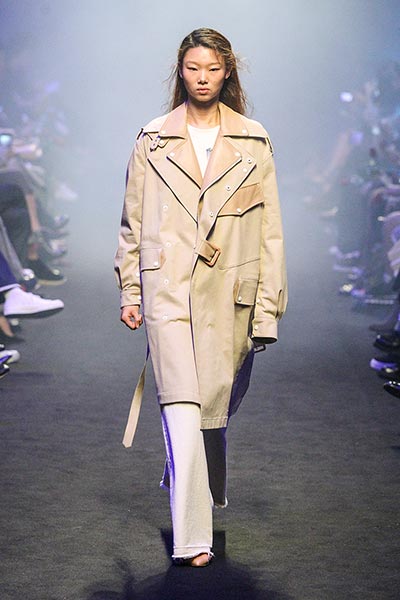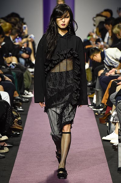 Via a collaboration with Disney, Surreal But Nice took as its inspiration the film Beauty and the Beast – perhaps given its forthcoming cinematic release – for the spring 2017 collection. “Beauty and fear coexist,” said co-designers Su-hyung and En-kyoung Lee. “When one overcomes the fear, then one can be confident.” Despite the collaboration, characters were not overtly referenced, ensuring the collection was elevated beyond polite nods to Disney. Snipping collars and the back of a jacket in a rough manner made a tailored wool jacket look atypically balanced with voluminous pants and a tight-fitting dress. There was a suggestion that dresses and dress shirts modified and designed from wool flannelette shirts could be worn as casual clothes, which received a lot of attention.