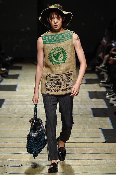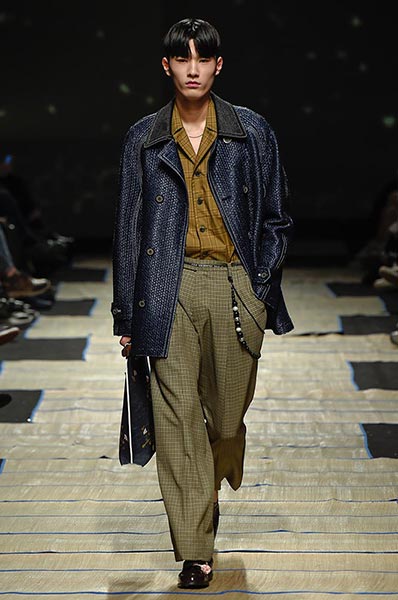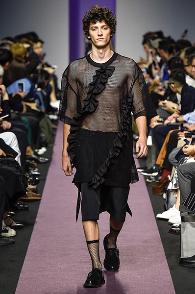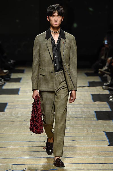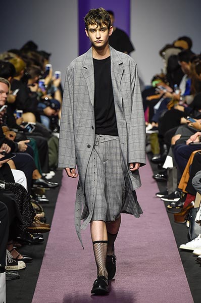 “I wanted to make this collection from a wide variety of materials,” explained J Koo designers Jinwoo Choi and Yeonjoo Koo. “Like a collage.” With wool anchoring the men’s and women’s spring 2017 collection, textural diversity was added with the inclusion of mesh, tasselling and silk ruffles, taking conservative tailoring to innovative new heights that nodded to both the 1930s (tailored wool trousers were sliced to reveal fishnet stockings, and paired with fringed dresses in the spirit of VictorVictoria) and the 1980s (checked wool suiting was exploded to oversized proportions, with blazers that draped from the shoulders like Wall Street power suiting).