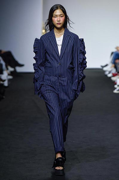 Jain Song’s aesthetic draws on the traditions of men’s tailoring, with pantsuits crafted from pinstripe navy wool cloth, but for spring 2017, they were elevated by the creative mastery of the designer’s cuts, resulting in dramatic effects on the body. Lightweight and easy-to-wear for the warmer months, featured was a long-line, shawl-lapel blazer paired with wide-legged pants slit up to the knee, and a wool boiler suit replete with ruffles along the arms, bringing femininity to a garment historically rooted in men’s work wear.