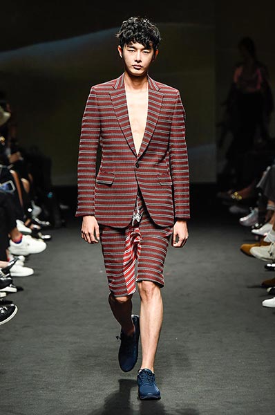 Top: Model Seojiyeon wears a striped navy wool suit at Seoul Fashion Week.