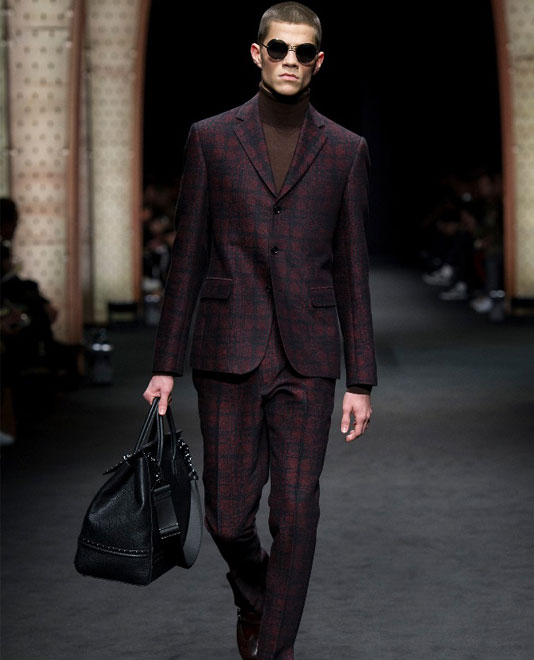 That’s something typically interesting about Fendi, too – the way it can reinvent warm, fuzzy fabrics – shearling, wool boucle, and its signature fur – each season, and this collection was perhaps the greatest example. For all the negativity in our news feeds, Fendi opted for an altogether more upbeat note for its fall/winter collection, looks that blended 80s-style sportswear (the Tenenbaums come to mind) with the sort of quality construction and fabrication you expect from a house of Fendi’s status. Wool overcoats featured contrast fur collars and sleeves, tracksuits featured boldly-coloured stripes down the sides, headbands brandished slogans such as ‘yes’, ‘fantastic’ and ‘love’, and wool suiting was made youthful with zippered fronts and ticket pockets. Fabric seemed to be on the agenda, too, at Versace, with the designer exploring various iterations of wool tartans and checks for the modern man. There’s no denying that the Italian house is super refined in terms of the shape of its clothes: structured, broad-shouldered and with a moderately slim leg and waist.
