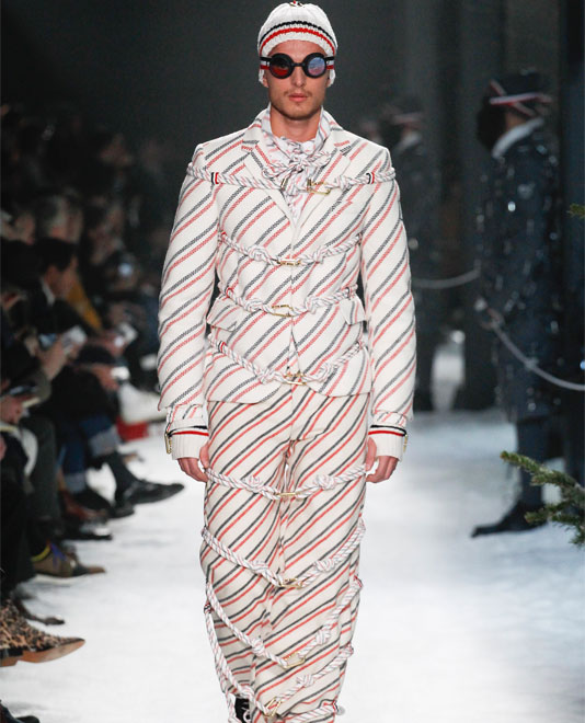 For Thom Browne, subtly is largely a foreign concept, and yet despite the theatricality of his presentations, at their core his garments are always practical, and wearable, pieces. Such is the case with his latest collection for Moncler Gamme Bleu. As in previous collections, Browne tapped into a specific concept – in this instance: mountaineering – and found ways of telling a story. Here, climbing wraps wrapped and bound the wearers’ bodies, wool suiting was padded so as to become outerwear, and traditional fabrics, such as Donegal tweeds, were integrated into the collection, bringing a youthfulness to that most traditional of fabrics.
