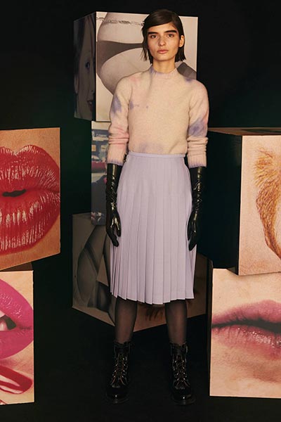 Antonio Berardi, too, looked to British cultural history for inspiration, but landed at a very different place: Shakespearean drama. Specifically, the designer was interested in that most evil of literature’s characters, Lady Macbeth, presenting outfits as she might have worn them today. These included A-line skirts embellished with drawstrings, long-necked wool knitwear with cut-outs, like a bodice, and puffy-sleeved Merino wool sweaters bejewelled with crystals in traditional diamond patterns, here worn with drawstring pants for a more casual effect. At Ports 1961, creative director Natasa Cagali was also interested in ways of embellishing, presenting a wool-rich collection of asymmetric tailoring and oversized knitwear, the most daring decorated with plastic paillettes or with feathered edges.