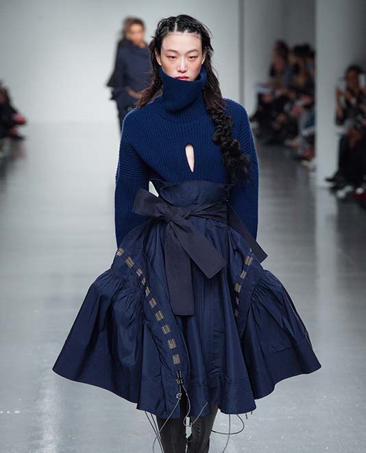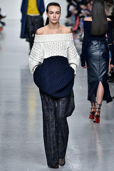 Korean-born designer Eudon Choi regularly walks a line between masculine and feminine, tailored and unstructured, and that concept threaded through his collection for fall/winter 2017 with garments that played with proportion. This came in the form of expertly tailored wool suiting and outerwear (wide-legged trousers, bell sleeves quilted parkas were key), but particularly interesting was his take on knitwear and how it could be worn – or, in some cases, not. Abundant sleeves, oversized funnel necks and super chunky knitting techniques elevated the classic items to pieces of art. Teatum Jones is masterful in its approach to knitwear, having won last year’s International Woolmark Prize for the designers’ interest in pushing the boundaries of the form. This season, they took those ideas to new heights, fusing colours (off white and navy, for example) with knits (waffle with twilled stripe stitches) in off-the-shoulder and three-dimensional sweaters.