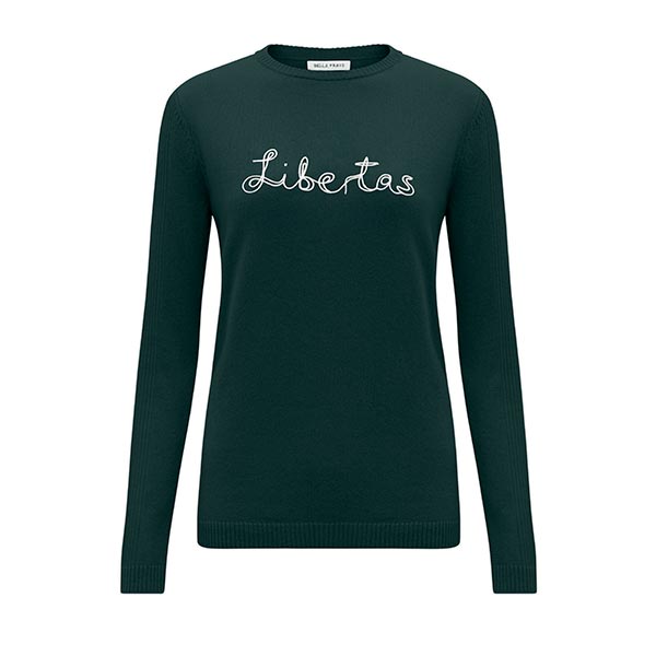 Kate Moss thinks Allen Ginsberg is a god. And Alexa Chung is mad for Jane Birkin. At least those are the messages they’re spreading with their wardrobe, both fashion icons fans of British designer Bella Freud’s luxurious embroidered Merino wool sweaters emblazoned with brilliantly witty intarsia. Freud herself has been spotted in one such sweater emblazoned with ‘psycho analysis’ – a nod, of course, to her famous neurologist great-grandfather, Sigmund Freud. As the daughter of that most famous of British painters, whose daring work pushed the boundaries of contemporary art as it was known, it seems fitting that Bella’s namesake fashion business has found such success through her embrace of multi-disciplinary creative practice. “I’m always looking for an idea – it doesn’t matter where it comes from,” says Freud simply.