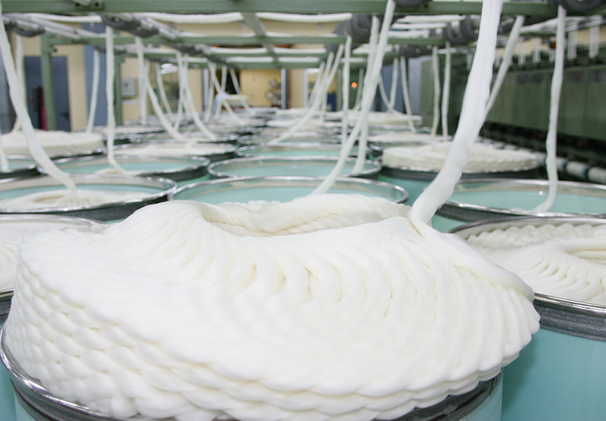 Spinnen: Vor dem Verspinnen wird das gekämmte Faserband einer Reihe von zusätzlichen Ausrichtungsvorgängen unterzogen, um die hakenförmigen Fasern wieder in die parallel ausgerichtete Position zu bringen und eine vollständige Durchmischung der Wollfasern zu gewährleisten, was schließlich zu einer homogenen Mischung führt.
