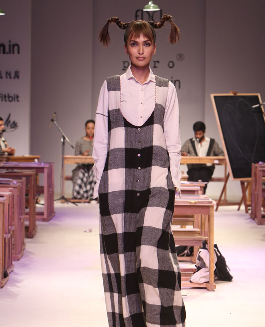 At Aneeth Arora’s Péro was a whole lot of hand-woven goodness that she’s loved for. While outwardly lighthearted and whimsical, she presents clothes that are created with great care, love, and attention to detail. Taking her cue from uniforms, she took us back to school with relaxed layers in solid blacks and whites or monochrome ginghams. 3-D poppies, lace trims and embroidered billets-doux provided finishing touches.