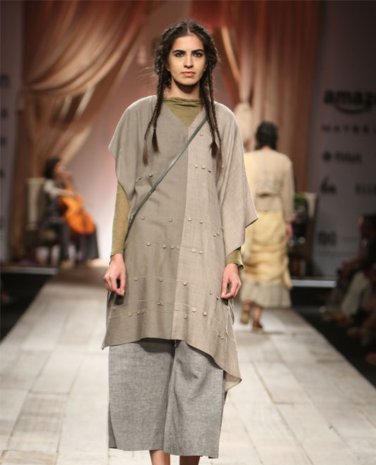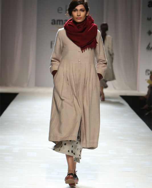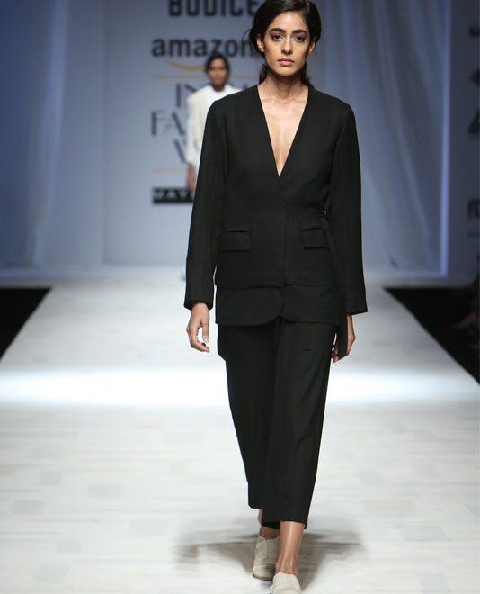 A favourite with city girls for her cool minimalism, Ruchika Sachdeva’s Bodice delivers solid wardrobe builders every season. Trenches, shifts, tunics, straight coats and skirts abounded in a trusty palette of naturally dyed olive greens, indigos, blacks, greys, and whites. As much as her silhouettes, it’s her fabrics – wool-linen blends and cool wools, for example – that propel her clothes further into “I’ll-have-one-of-each” territory. While this season was definitely a leaner silhouette than usual, her use of binding as a detailing technique (especially on knife-pleat skirts) ties the last few season together and acts as a clever, very visible trademark.