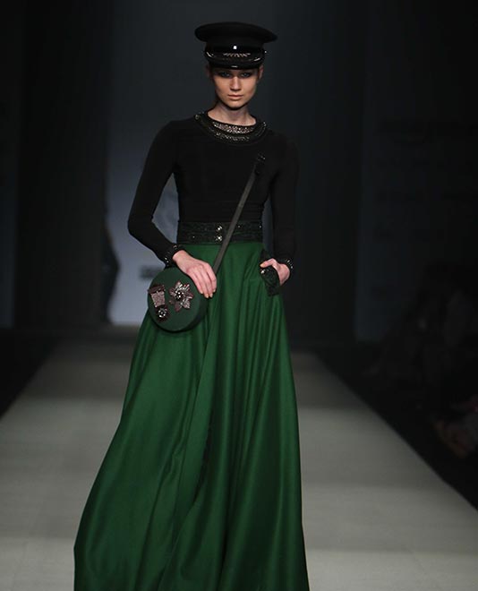 In keeping with a global proclivity for all things military, Pankaj & Nidhi looked to European uniforms of old. Pencil skirts, big trousers, capes, and coats in Merino wool were detailed with all manner of regalia – epaulets, buttons, brooches, chain fringes and braiding. Black sequins detailed mustard yellows, olive greens, and navy blues. An attempt to sex up the latter half of the collection resulted in sheer panels, body-con dresses, plunging V-necks and lots of gowns.