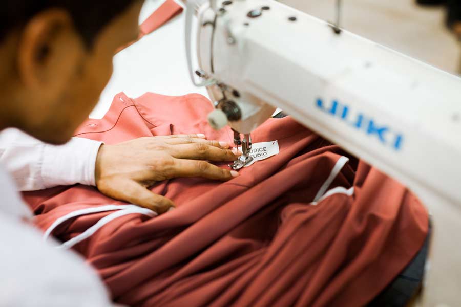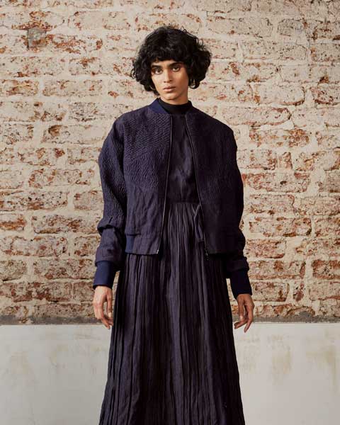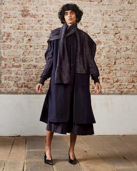Equally, she was also careful to not leave out India’s technological advancements. She enlisted Raymond, one of India’s oldest family-run mills, to produce a custom colour story, as well as custom weights. Here, she added another dimension – an anti-microbial coating made with neem, as well as a UV filter coating.