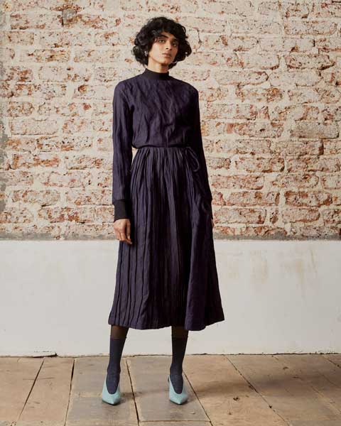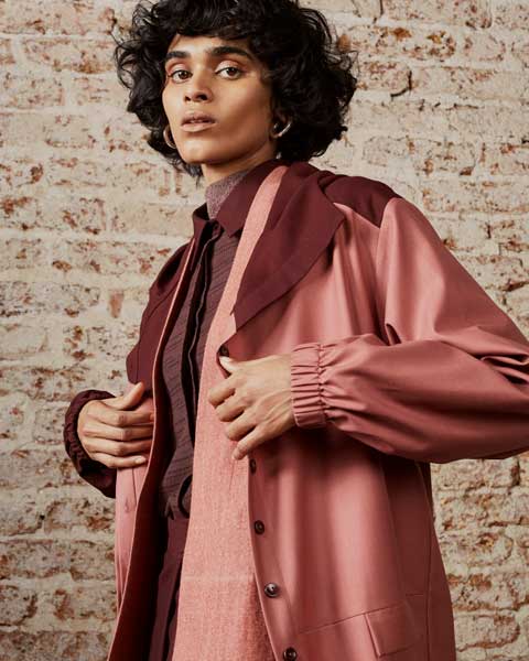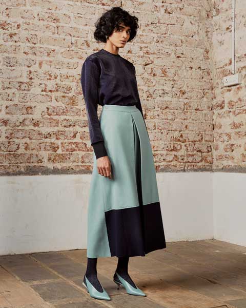 Colour, not usually a Bodice preoccupation, was her starting point. “Because wool,” she explains, “has this lovely quality, which almost enhances colour, it gives it a subtle sheen.” Her palette took its cue from celebrated Indian Progressive artist Tyeb Mehta’s works, all pale pinks and greens, with burgundy, navy and forest green. “He believed in the power of colour to express emotion, and I’d just never related to colour like this before.”