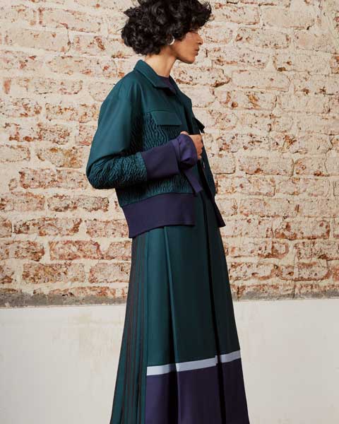 Indeed, all of Bodice’s smart practicality comes from an emotional, personal place. Her Woolmark journey started at Bhuttico, a weavers cooperative in the Himalayas, where she developed fabrics using the extra-weft technique. “With Bhuttico it wasn’t just about the textiles, as with any given place, it’s not just what they’re making, but the whole experience that counts. And Bhuttico’s history is very romantic to me – where it is situated, the fact that weavers live where they work. I find that sense of comfort really enchanting where you just wake up and start working. The weavers lead a good, happy life, and that energy translates into their work.”