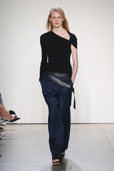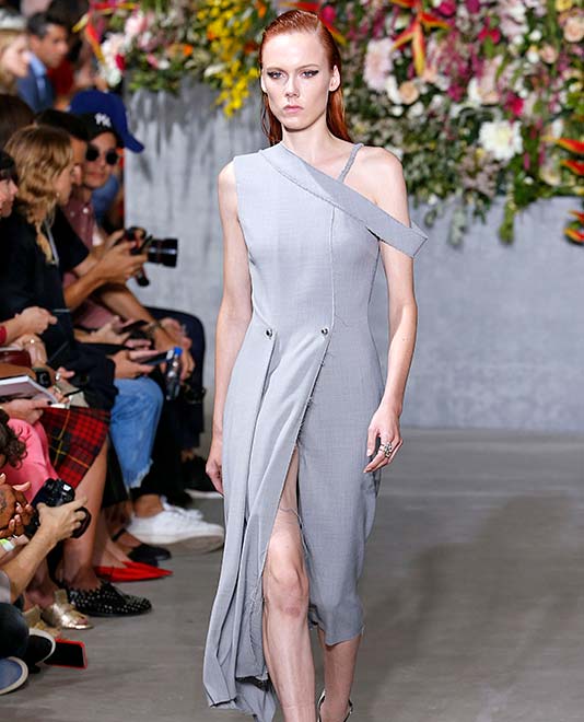 Jason Wu harnessed one of the strongest trends of the season, deconstructed tailoring, to dress down his spring-summer collection. A classic blazer was dropped on the shoulder and entwined with the model’s wrap-skirt, and a standout asymmetrical grey wool dress hinted at double-breasted tailoring, but slipped away from formality with extended, loose panels and raw edges.