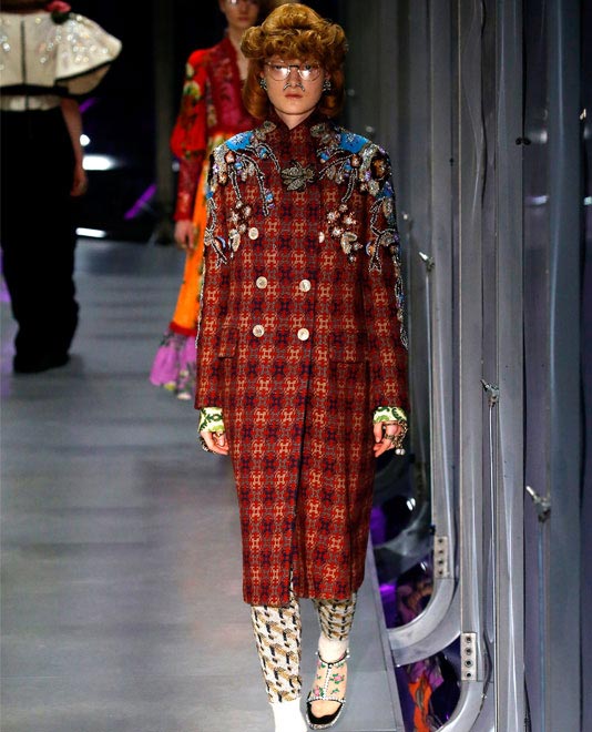 Reports of Alessandro Michele’s reinvention of Italian house Gucci have been common in their description of his designs as allowing us to dream. Indeed, his seasonal collections transport us as we journey through a cosmic combination of references as far-ranging as British punk through 18th Century regalia. Fall/winter 2017 was no exception, contrasting the streamlined finishes of Versace and Jil Sander with a 1980s, David Bowie-tinged collection that was as bejewelled as it was colourful. The show, staged the brand’s new Milan headquarters, opened with a knitted wool cardigan, but it was the subversive take on it that made it feel modern, worn with a matching knitted beanie, eclectic gold jewellery and studded shoes. Oversized coats were embellished with sequined and velvet flowers and bows, Herringbone wool suiting was cut with flared trousers, and featured velvet detailing, and tweedy jumpsuits were feathered at the edges. This sort of romanticism was evident in the collection of Alberta Ferretti, too, with knitted wool sweaters paired with frilly, sheer skirts, and nautical wool sweaters cut with long, draped sleeves.
