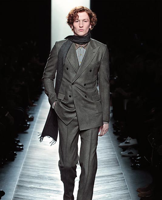 Bottega Veneta’s creative director Tomas Maier explained that he “wanted to create a line that’s very long and lean, with everything elegant and elevated.” And with pants that kicked out from the ankle in a subtle flare, coupled with double-breasted blazers that cinched at the waist and splayed from the lapel, Maier certainly achieved an elongation of the male form. What stood out in this collection was a deconstruction of the suit, but not with the inclusion of sportswear elements as the designer has done in the past. Instead, wool knitwear, such as turtleneck sweaters and sleeveless vests, offered an alternative to shirting; belted overcoats replaced blazers; and knitted wool scarves worn over the top of full looks, trailing at the back, added a level of nonchalance in the styling. “This man knows what he is doing,” says Maier. “There are no tricks, nothing ostentatious. It is very discreet, but if you look closely, it is very special.”