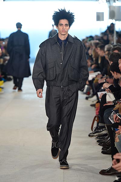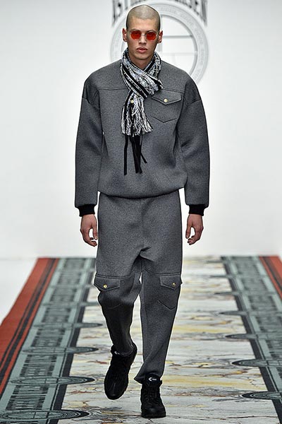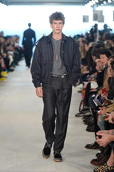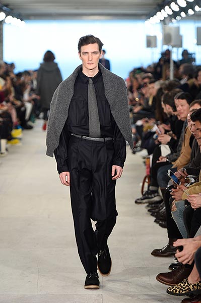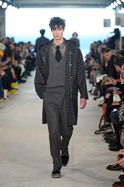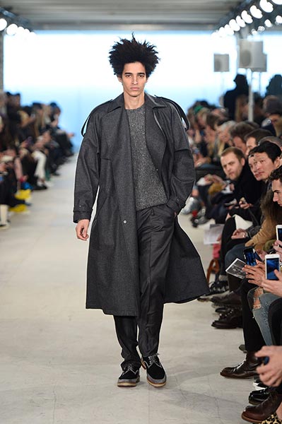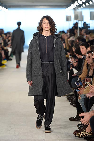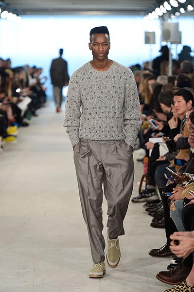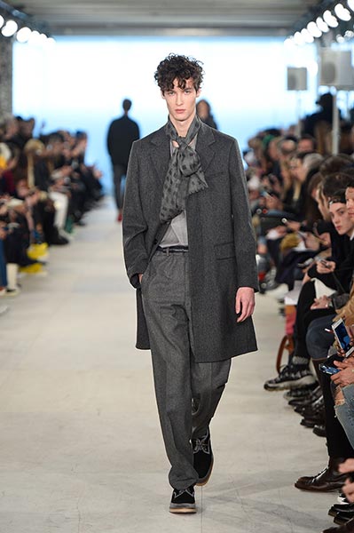 At E. Tautz, the youthful ready-to-wear line originally founded as a military tailoring house in the late 19th century and now owned by Norton & Sons, creative director Patrick Grant mined his own archive (quite literally some of the clothes he wore to parties and roller disco during the 1980s in Edinburgh) and ran it through the filter of a Savile Row cut and cloth. The resultant collection comprised lightweight, oversized coats, high waisted, billowing trousers, scoop-necked wool tees and playfully large ties, all of it rendered in enough shades of grey to make E.L. James jealous and in interesting variations of wool. Norton has long been fond of the fabric, forming as it does the cornerstone of both of his brands, but in this collection he took it further, blending it with mohair for coats, crafting typically casual Merino wool pieces, such as tees and button-down, pocket shirts, from it, and hand-knitting it in sweaters, effectively crafting a collection almost entirely from wool.