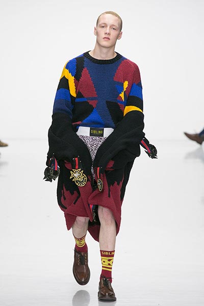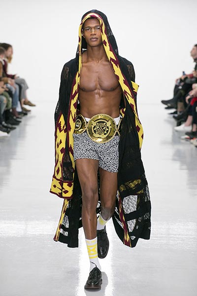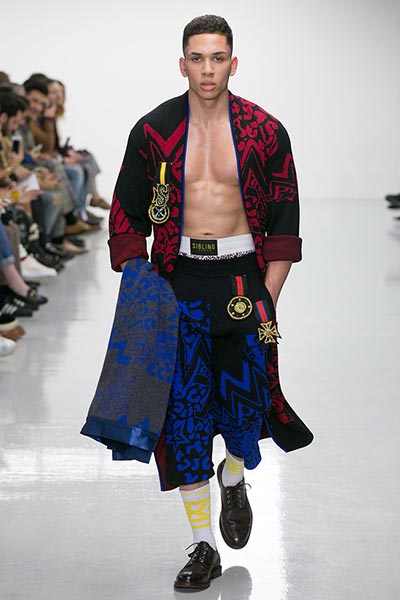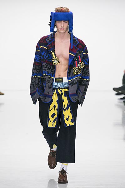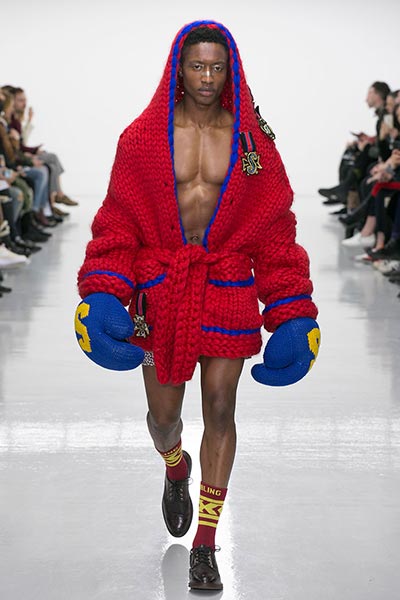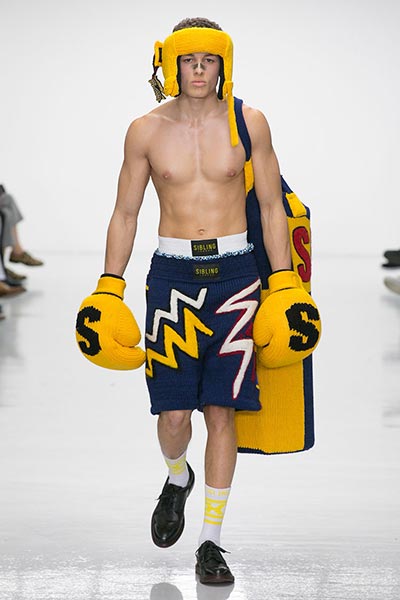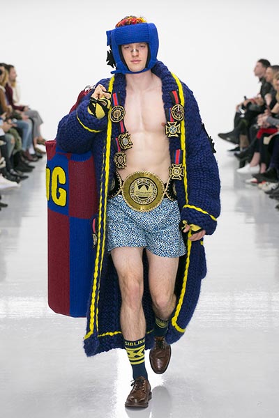 Knitwear, of course, is something for which on-the-rise London label Sibling is well known, and that technical virtuosity was on full display in this season’s collection. If you’ve seen a Sibling show before, you know that subtlety isn’t a key ingredient to the designers’ approach to fashion – indeed, this presentation closed with a floor-length robe-like coat comprised of thickly knitted Merino wool yarn in navy blue with golden yellow trim – but this season, they countered show-stopping brilliance with more wearable pieces, too. Some of those robes and blankets were worn over beautifully cut, baggy suiting crafted from Dormeuil wool, one of the world’s finest cloths, said to be inspired by those of 1980s American artist Jean-Michel Basquiat, which accompanied knitted wool sweaters in graphic patterns, alongside Merino wool knitted boxing gloves and head-guards to complete their boxing theme.