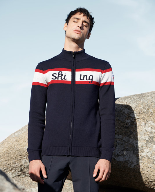 The SKIING cardigan is an updated version of the classic Fusalp sweater and is also available in dark blue and sepia grey.