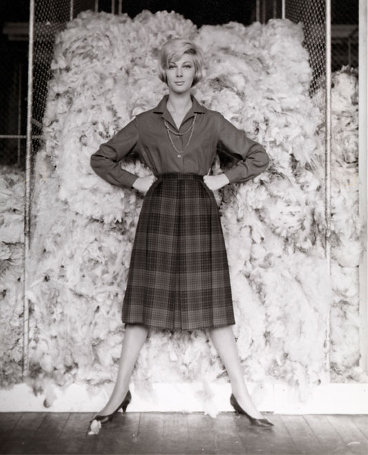 (Left) Henry Talbot, Fashion illustration, model Janice Wakely standing in front of wool bale, 1961. Henry Talbot Fashion Photography Archive. © Lynette Anne Talbot