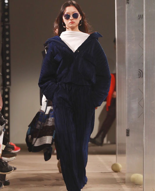 These layered design stories, the small touches, make ffiXXed Studios a deceptively intricate design brand. In one coat from the current season, a pleated lining hangs below a side split to mid-thigh, making it look as though there is a pleated skirt under the coat. In signature wrapped skirts and overlaid pockets, square and rectangular pieces of structured fabric give soft silhouettes a harder edge.
