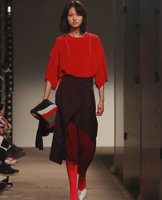 Another highlight of the current collection is a series of pieces made with hand-made custom weaves using recycled materials from seasons past. Using a repurposed hand-held jewellery drill, 10 or 20 metre fabric scraps were deconstructed and reconstructed into patch-worked wrap skirts and round-neck pullovers.