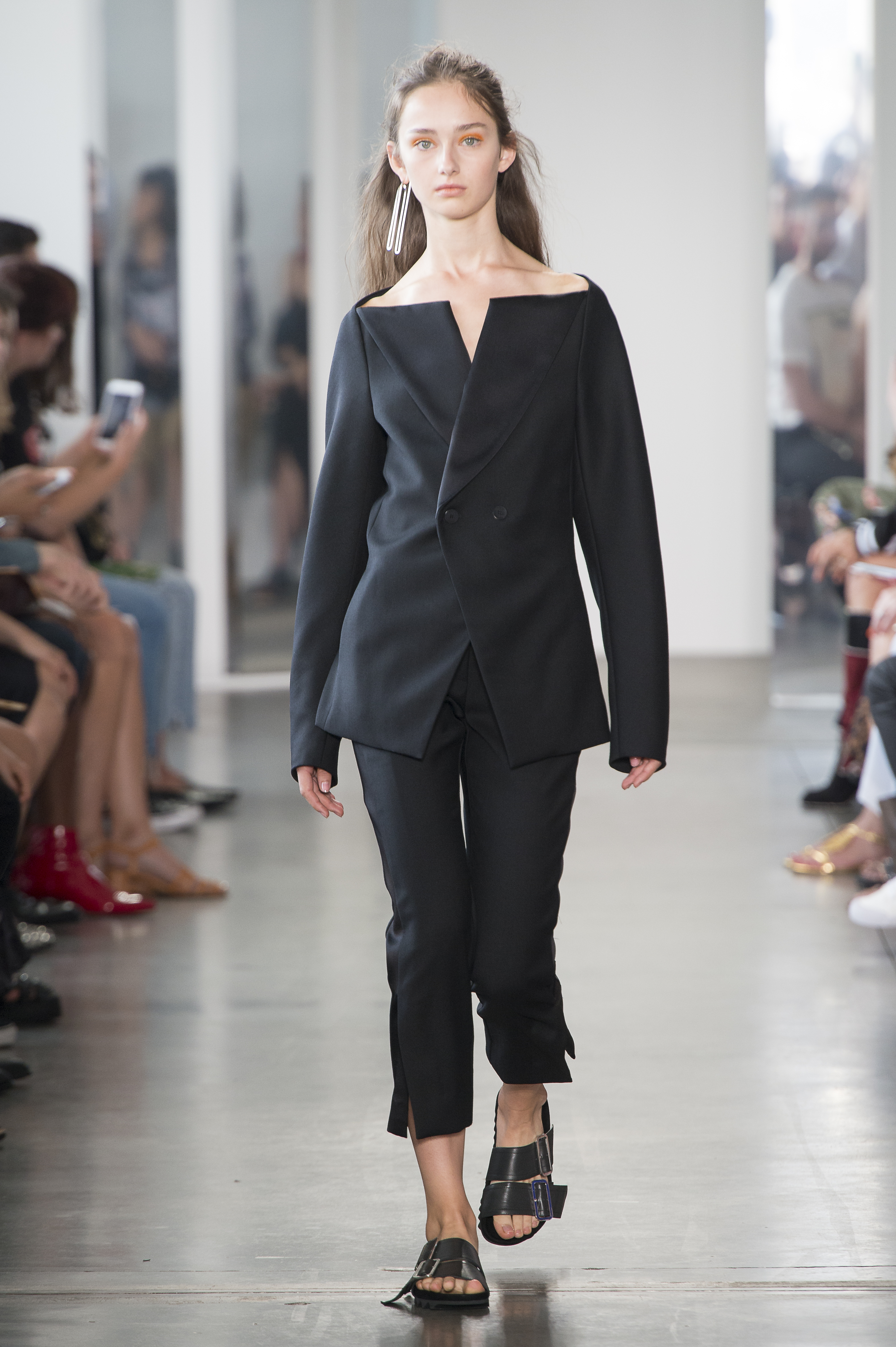Yet while tailoring evinces notions of a stuffy corporate wardrobe, the offering here was far more aspirational and, in the case of International Woolmark Prize finalist Dion Lee, sexy, too. Riffing on his penchant cut, and expanding on his newly launched range entitled SUIT, the Australian-born, now New York-based designer showed how innovative blazer and trousers ensembles can be, cutting fine Merino wool into a double-breasted tuxedo with exposed shoulders, and cropping the pants above the ankle, side splits adding flare to the cigarette-thin shape.