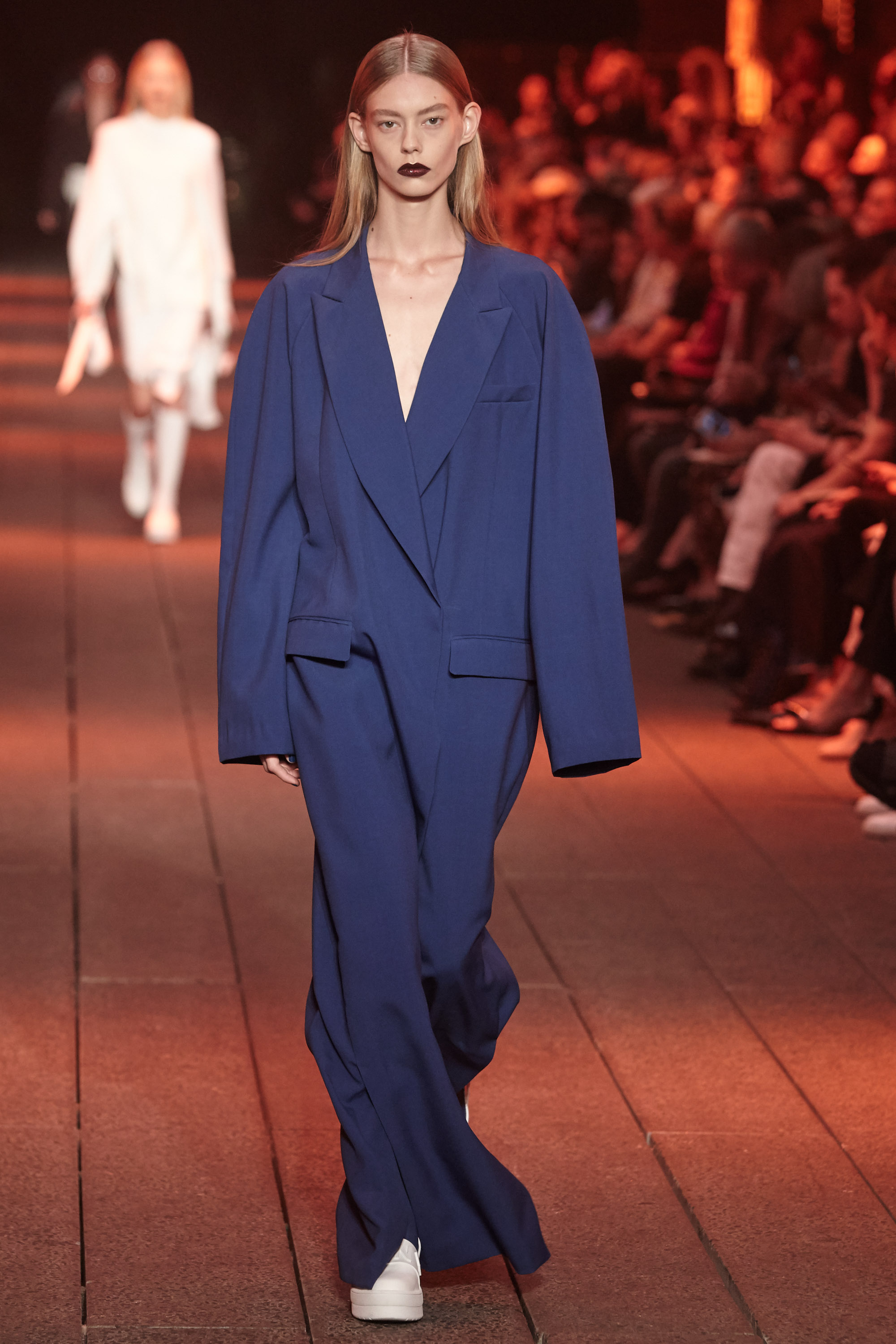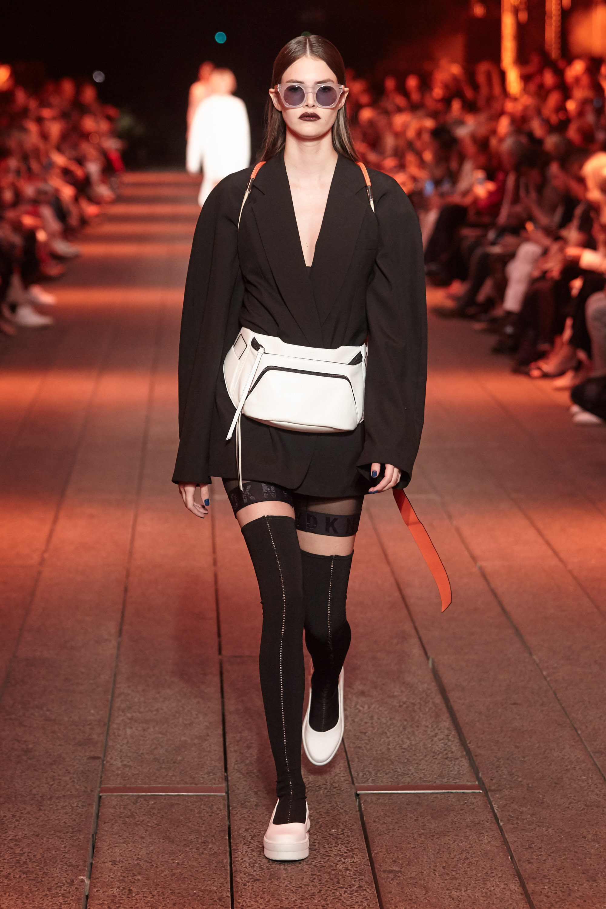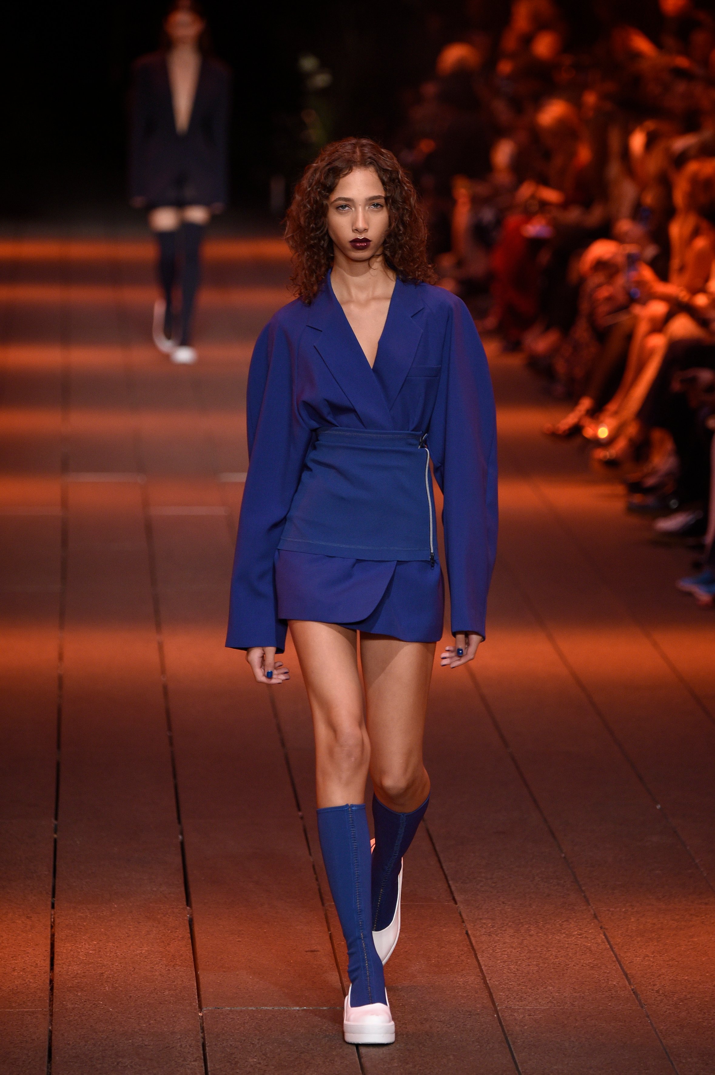 The DKNY girl, via the vision of Public School design duo and former International Woolmark Prize winners Maxwell Osborne and Dao-Yi Chow, is a confident one, leaving the trousers behind altogether, as in the opening looks, in which oversized double-breasted wool suiting in cobalt blue was teamed only with boots and matching nail polish, and fastened around the waist so as to shape the body in sharp lines. The highlights in this collection, staged atop the high line and marking the first with the new designers at the helm, were many, with the pair bringing their streetwear sensibility to the storied New York brand, a diffusion of Donna Karen, such as with slouchy, double-breasted wool jumpsuits and voluminous wool overcoats in vivid orange.