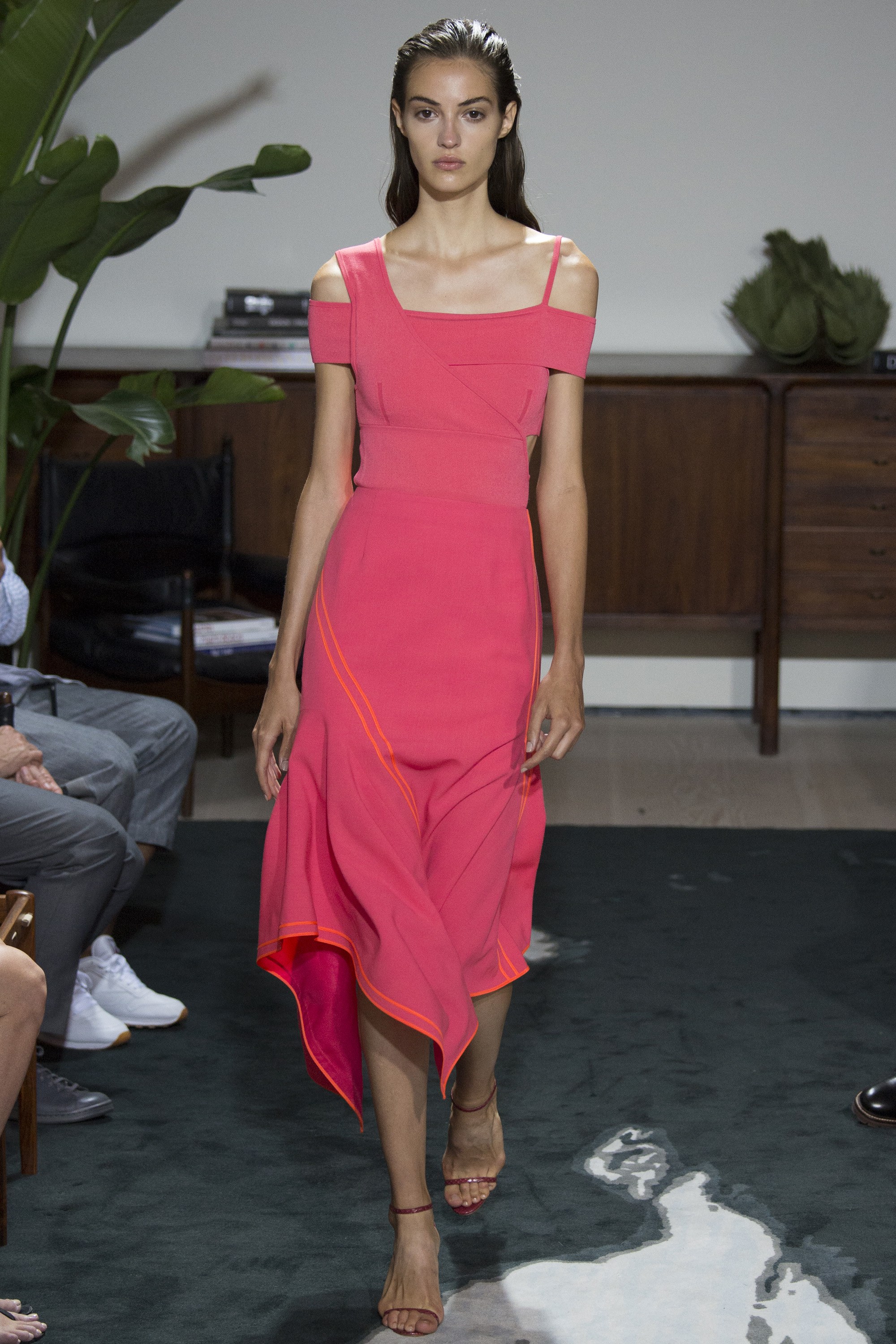 Where Jason Wu’s collection opened with a double-breasted Merino wool look, too, he evolved it in his own unique way, extending its length into a coat-dress and finishing it with metallic taffeta pleats and binding, adding a sense of playfulness to the strictly tailored cut. Wu further used wool in his collection, with asymmetrical skirts and bandeau ruffle dresses in navy and flamingo pink delivering the flair for which his collections are much loved.