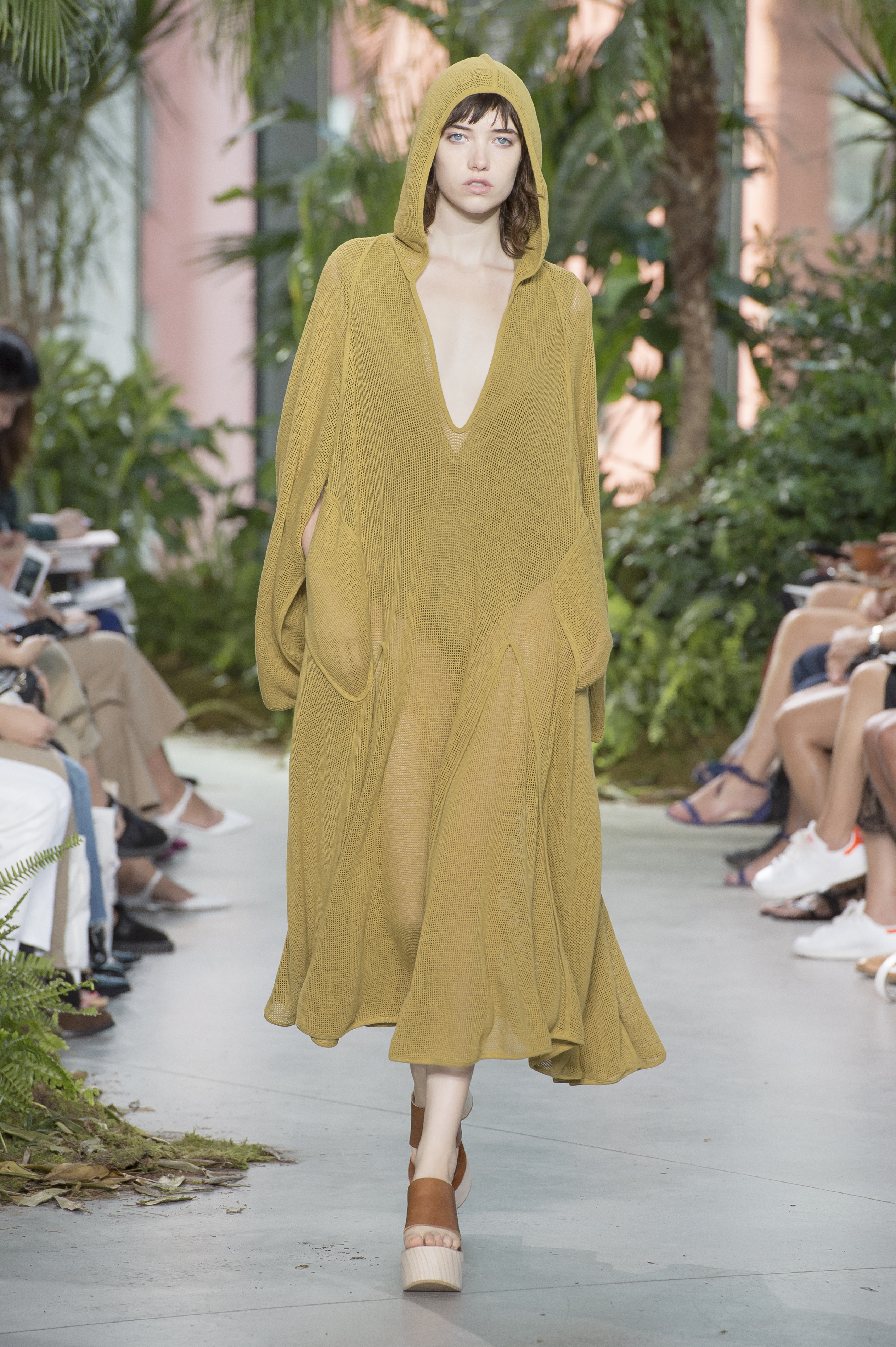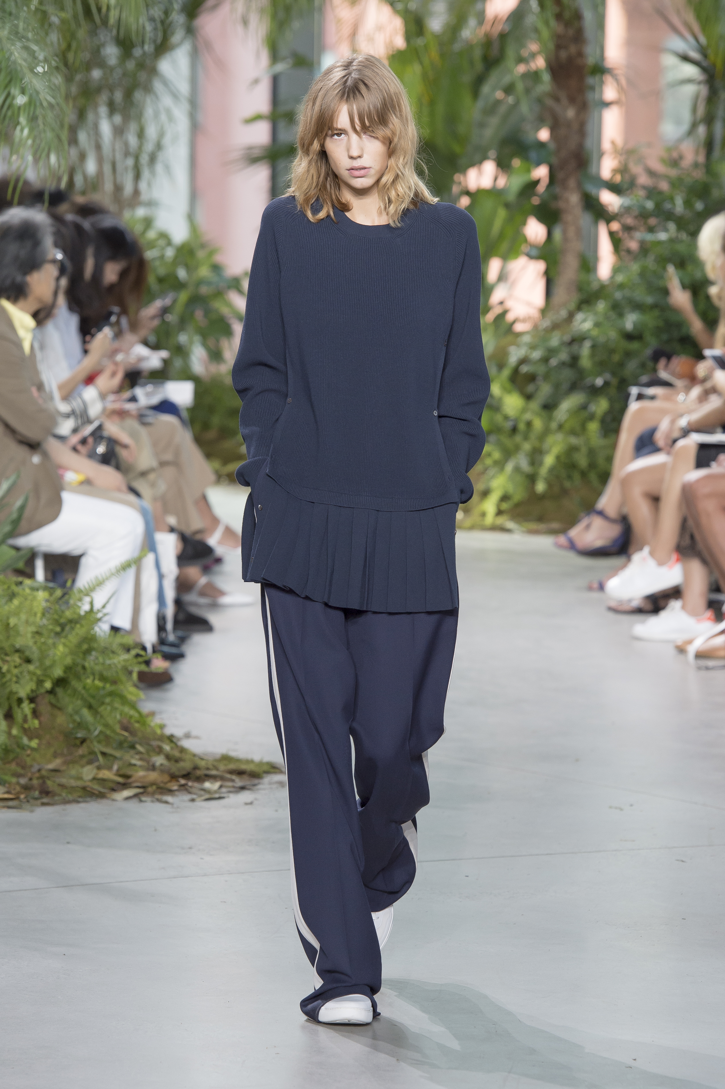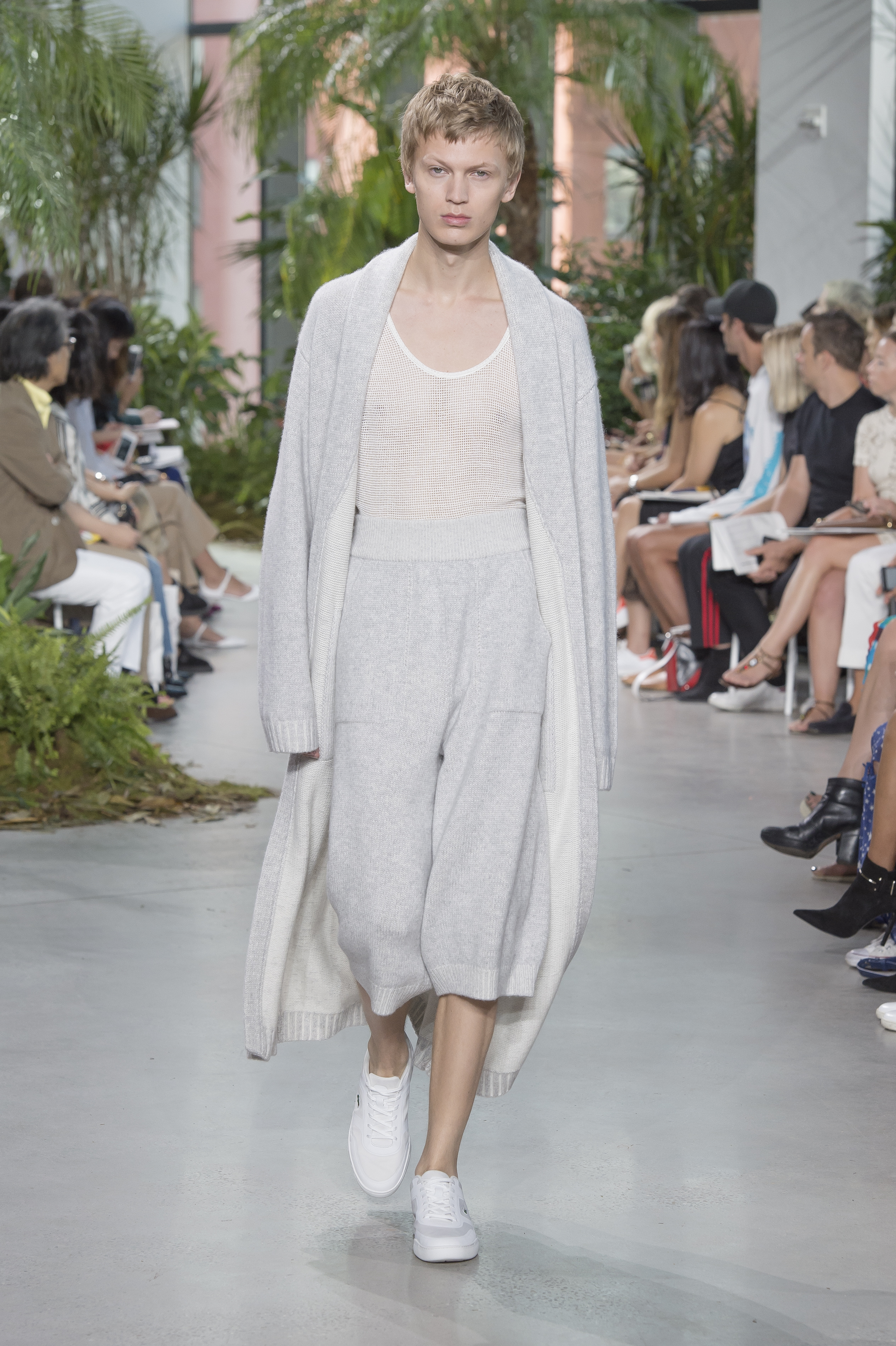French brand Lacoste showed a similarly sporty collection, but where DKNY took its cues from youth subcultures, it instead looked to its own history for inspiration, channelling the a thirties-via-seventies spirit of louche glamour. That included, for example, terrycloth robes, some belted like a trench coat, wide-legged trousers, and lightweight wool knitwear, such as cropped track pants, oversized cardigans and hooded throwovers. The effect, when shown in a brightly-lit, tree-filled studio, was of a glamorous island getaway.