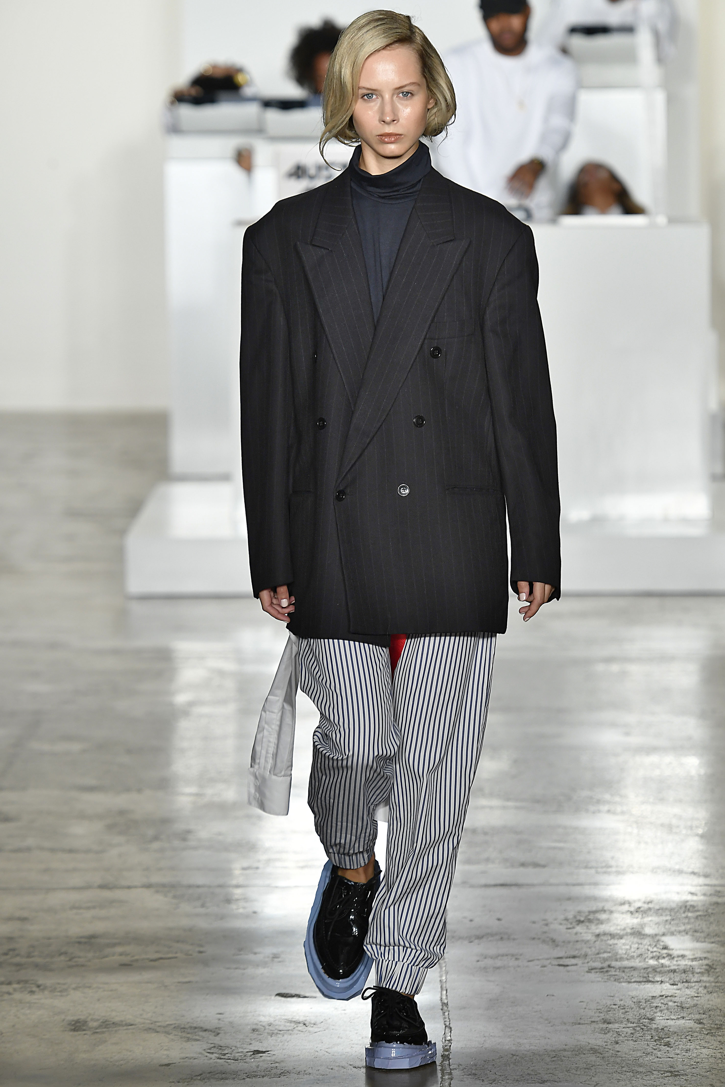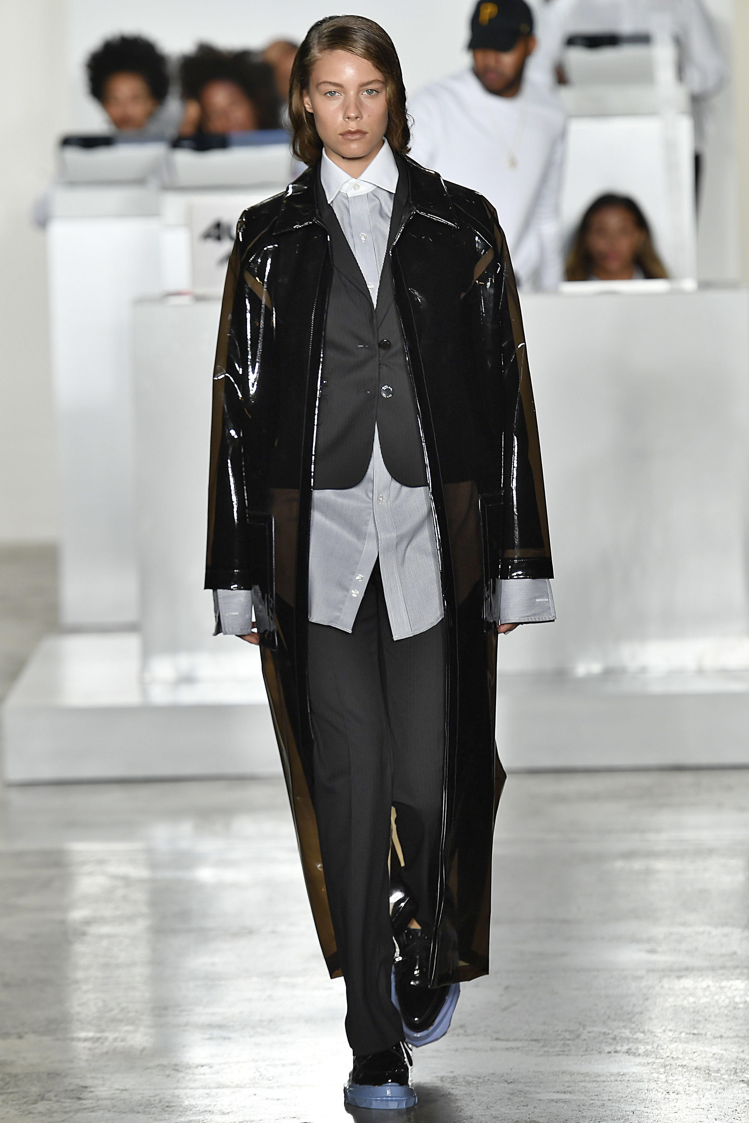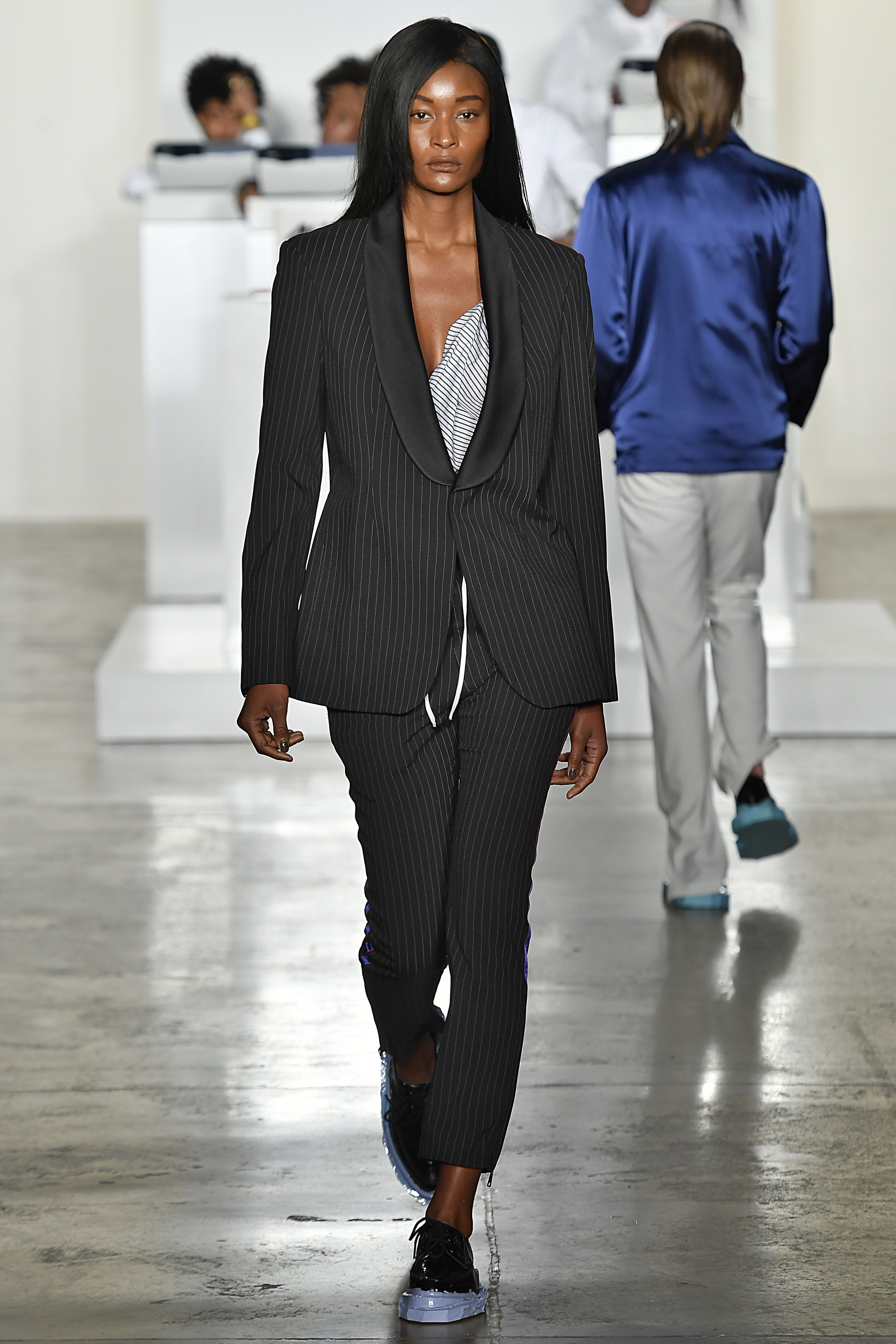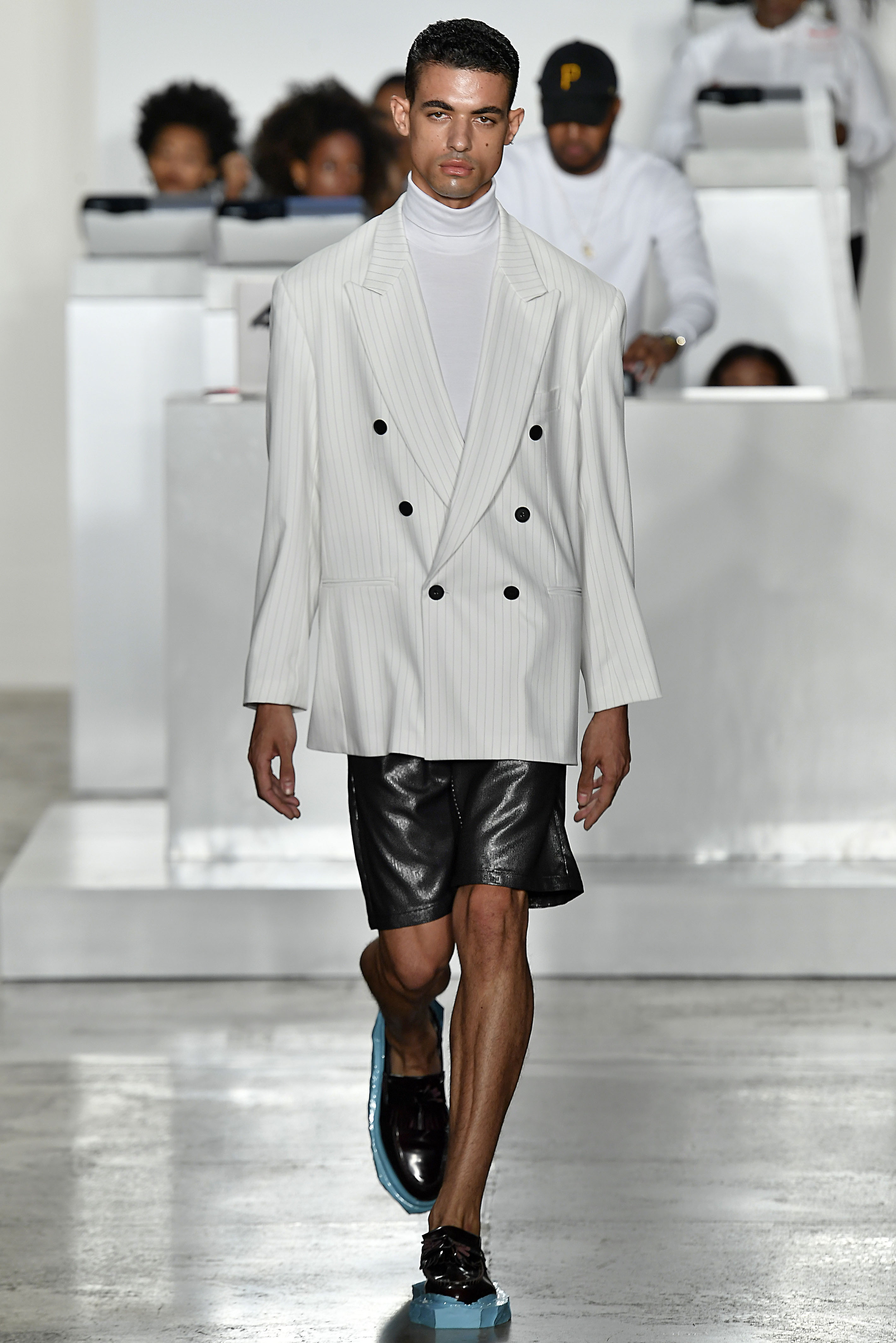 On-the-rise label and recent International Woolmark Prize nominee Pyer Moss explored suiting by subverting its classic shapes, with designer Kerby Jean-Raymond adding an appealing youthfulness in the process. Double-breasted blazers in white and black pinstripe were cut wide and low from the body, grey wool suiting was shrunk so as to appear cropped, the shirt layered beneath billowing out, and the classic wool tuxedo was overhauled with the addition of a nipped waist and sports-inspired trim down the sides of the trousers.