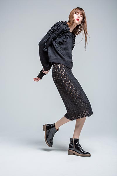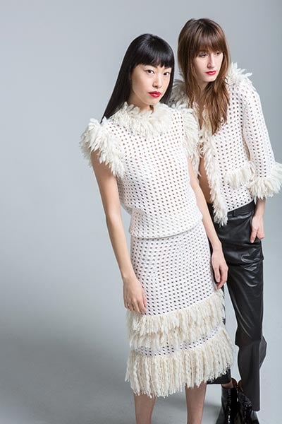 AS:Definitely. Handcraftsmanship is what we are all about right now. Keeping it alive and moving it forward in new combinations. Our designs develop their own personalities. I guess that's why they get their names after they form. They tend to evolve as we create them. Sometimes, Vlad will create a piece on a Saturday. On Sunday I might try it on upside down and backwards and it becomes something else. Other times I don't dare to touch his magic. We love combining knitting with crochet, wool with plastic ribbon, cashmere with tulle. Materials are very important to us. Texture, color and form are all part of the art. There is rarely a technique we haven't seen before. Vlad is an amazing technician. He's the fastest knitter I know. I am the worst knitter I know. But the big challenge is putting it all together in a fresh way.