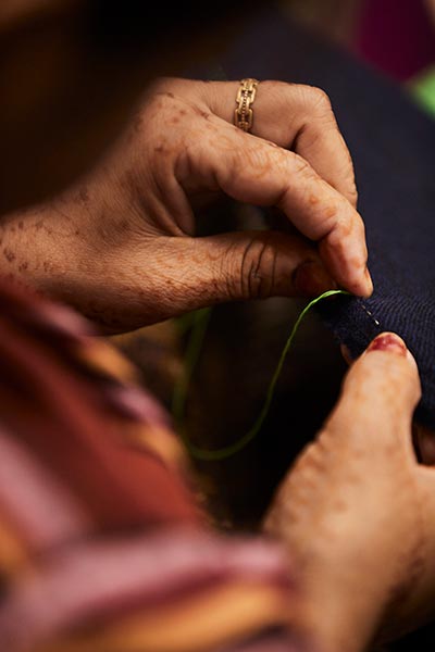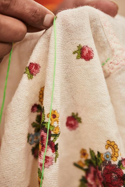 Delhi-based label Kashmir Loom is run by textile scholar Jenny Housego and her Indian partners Asaf, Hamid and Zahid Ali, who specialise in fine Merino wool, lambswool, and cashmere products. “In our country,” reports Asaf Ali, “it is fabulous that we still have the tradition and skills for weaving, embroidery, zardozi, you name it. What you can do with the hand here is incredible; we haven’t completely lost that knowledge. We’ve had the craft, but didn’t know how to market it, how to contemporise it, or the little design details and colourways that made a difference. When Jenny came she asked how we could take this craft skill, make it relevant, and yet ensure the long-time sustainability of this craft.” According to Housego (who is known for a textile that found its place in the Victoria & Albert Museum’s Fabric of India exhibition in 2015), in Kashmir, “women do the important job of hand cleaning and spinning the wool,” though do not weave. Women excel, says Ali, in aari embroidery on wool, in which a needle is used to perform chain stitches.