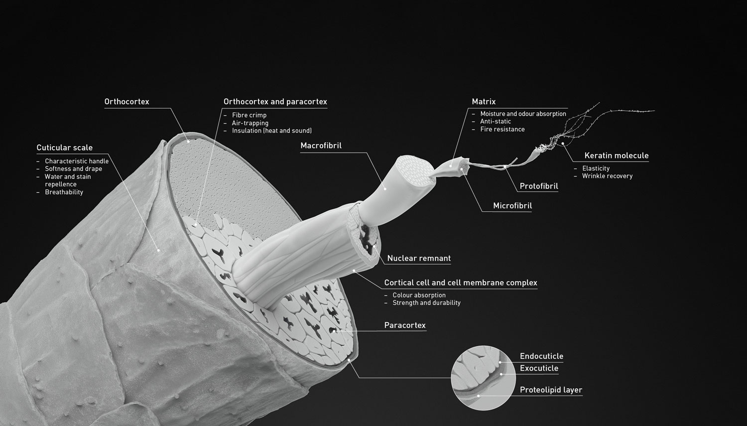 The protein chains that form the helical coil are the smallest parts of the wool fibre. They give wool its flexibility, elasticity and resilience, which delivers easy-to-live with, durable and wrinkle-resistant products.