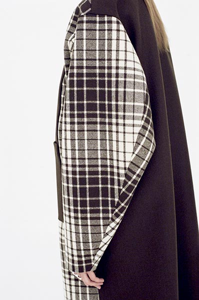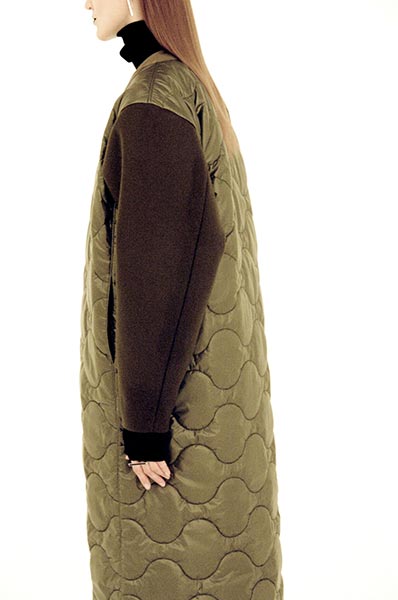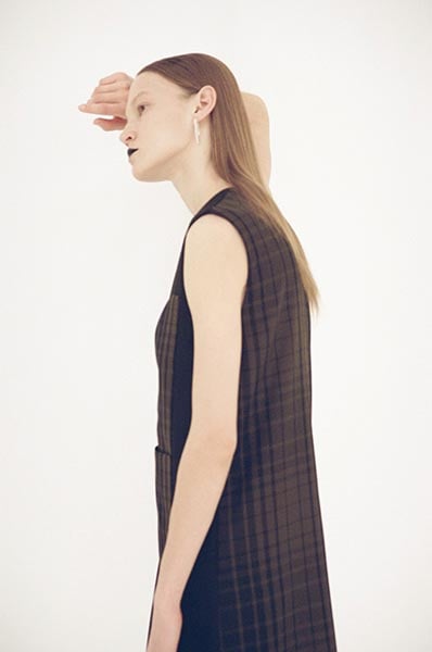 Yoshihara studied tailoring at a men’s fashion school, while Ode learned about making clothes firsthand growing up in her family’s sewing workshop. She apparently chose to wear small sizes of vintage men’s work and military apparel as a teen. “This is a womenswear brand made by a male designer and a female designer who is only interested in men’s clothing. That may be why we have been able to present such a good balance of masculine and feminine elements.” Work and military styles are the inspiration of HYKE’s autumn/winter 2016 collection. From checkered work shirts with patterns given a new look thanks to subdued tones to thermal cut-and-sew tops evolved into classy knitwear, the lineup is full of items with details traditionally associated with men’s apparel that have been masterfully rearranged into feminine items.