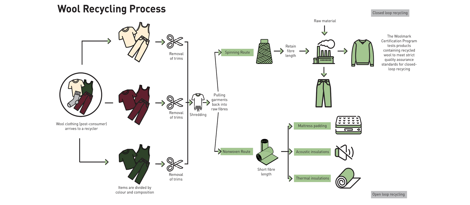The open-loop system is essentially ‘down cycling’ where wool products are pulled apart, often blending with other materials, and reprocessing into alternative products such as insulation or mattress padding.