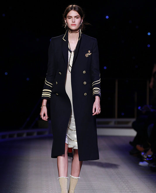 At Tommy Hilfiger, a designer whose very design aesthetic has regularly borrowed from traditional naval garb, a cruise liner entitled the T.H. Atlantic was parked in the centre of his New York Fashion Week show, a hint at the nautical-inspired collection that was to follow. Pea coats played a central role in Hilfiger’s play on theme, and while some appeared as though directly from a military surplus store – cut from thick navy wool and with gold and red embellishment – elsewhere, the designer took creative liberty with the garment. Cropped above the waist, sleeveless as a cape, and with satin and sequin finishings, Hilfiger imbued the historically menswear garment with a prettiness that will appeal to his legions of young followers, Gigi Hadid (who will later this year present a capsule collection for the brand) among them.