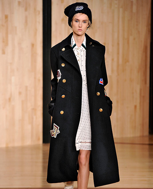 Since joining Coach as its artistic director two years ago, designer Stuart Vevers has been going about introducing a signature for the house by mining American subcultures (and their dress codes), serving up everything from Texan biker to 1980s Malibu surfer styles in the storied house’s recent collections. For fall/winter 2016, Coach’s collection had a feel of the Ivy League in its preppiness, although in his typically British manner, Vevers played with those conventions, mixing letterman jackets with gilded gold and silver heels, frill-embellished blouses with leather skirts, oversized wool sweaters with studs, and adorning naval pea coats with quirky cartoon patches. As a hero item in the collection, Coach’s pea coats came in various forms –cropped and cut close to the body, full-length and oversized, and everything in between – demonstrating the versatility of the classic garment.
