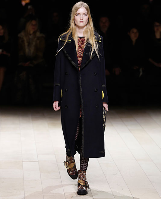 When it comes to military tailoring, Burberry knows its history, having officially outfitted British soldiers in its now-iconic trench coat during the first world war. For fall/winter 2016, however, chief creative officer Christopher Bailey looked instead to the naval pea coat as the starting point for the 1970s-inflected collection, offering different takes on the woollen garment. In playing with proportions, some were exploded to oversized shapes – worn with slim-cut trousers so as to balance the figure – while others, lined in red piping and gold buttons, were shaped snug on the body. Men’s versions were part of the mix, too, reflecting the interchangeable nature of the pea coat (read: borrow your boyfriend or girlfriend’s).