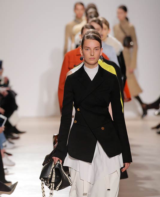 This irreverent sense of play was evident in countless collections across the show season. Proenza Schouler (pictured at top) used the fastenings of the traditional military pea coat but updated the navy wool item by wrapping it around the body; Prada embraced the naval theme – models wore the classic white sailor hats – but added a demure sexiness to the heavyweight coat by cinching it at the waist with a lace-up corset; Cedric Charlier layered his pea coats, wool chunky wool knitwear and tailored trousers in a more conservative styling; and at RED Valentino, a belted waist and lightweight wool fabric gave the garment a feminine edge.