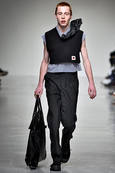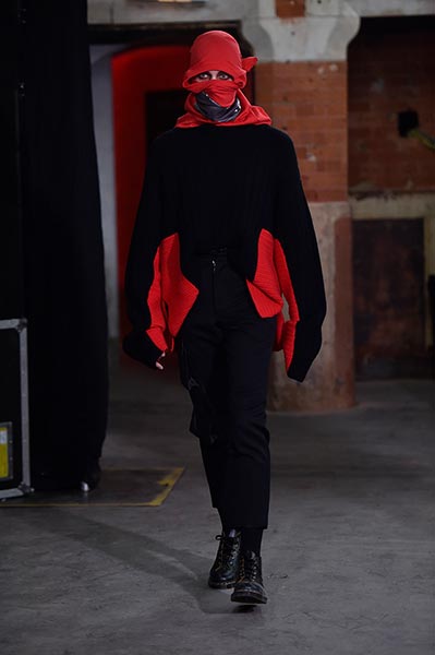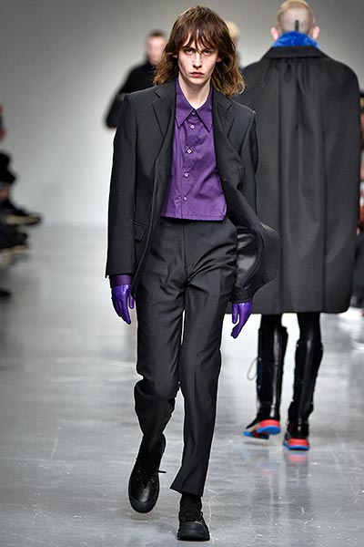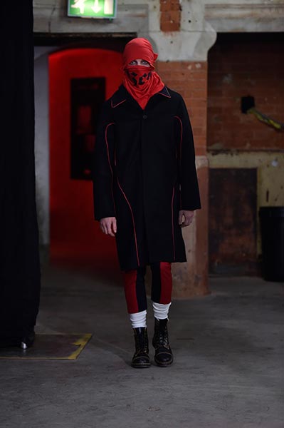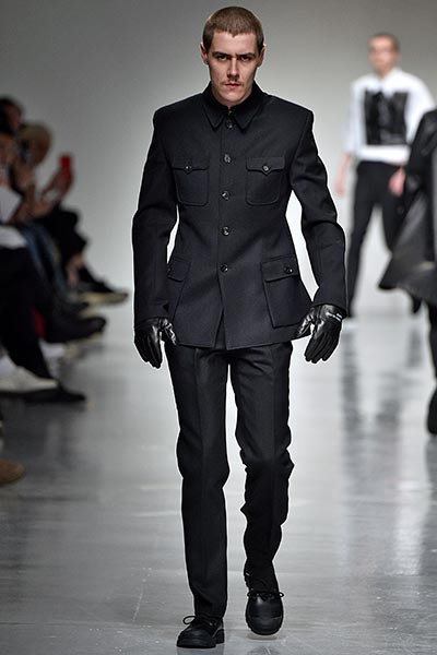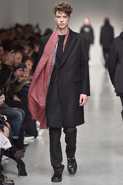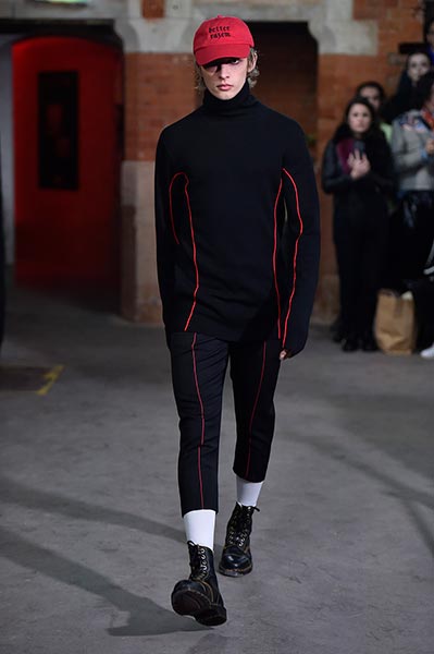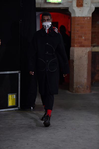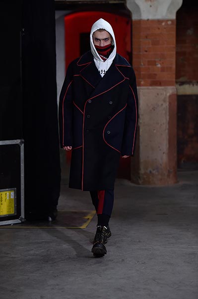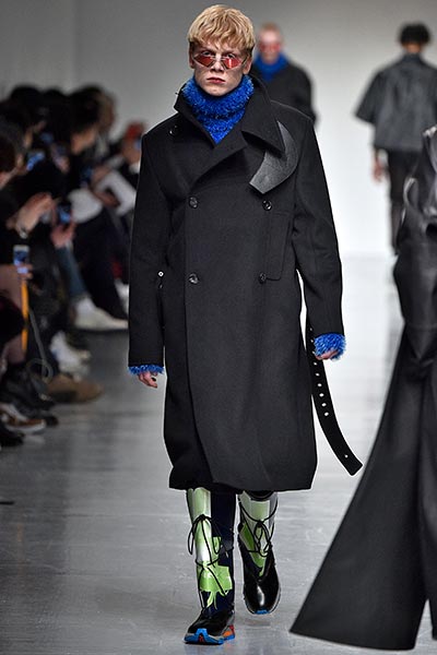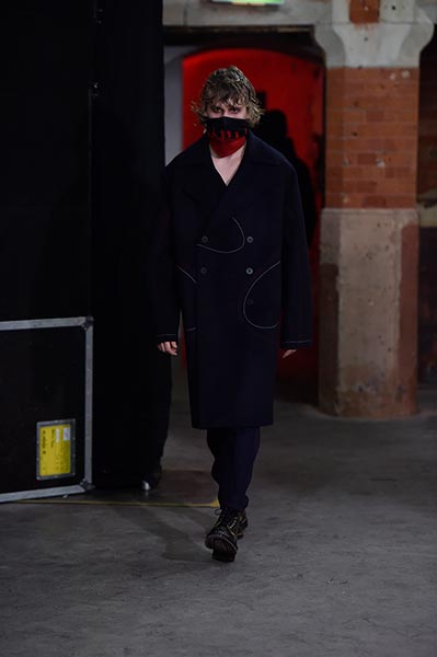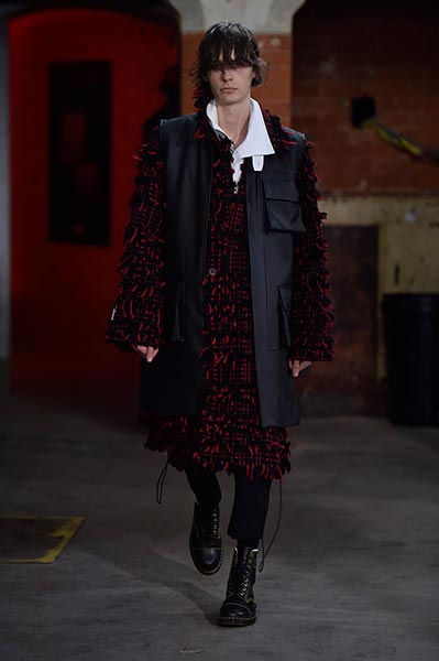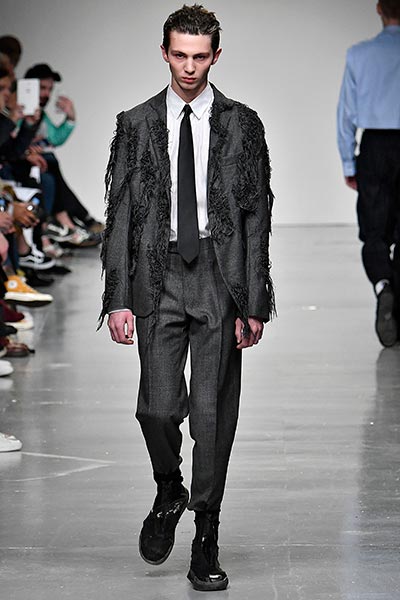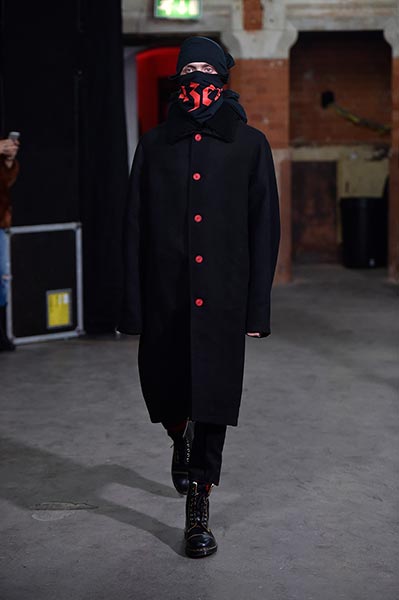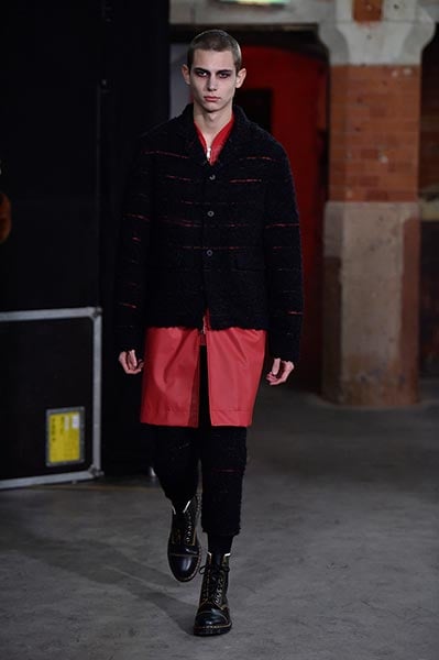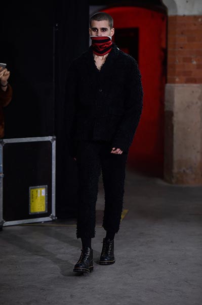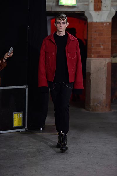 There was a level of showmanship to the Matthew Miller runway presentation – the models’ faces were striped with red paint, and jewellery and hardware (such as carabiner clips on oversized backpacks) helped to tell a story – but at its core, it was a concise and well-executed collection of men’s tailoring that will find love in the wardrobes of a raft of gentlemen across the globe. Luscious wool coats were cut straight to the body and left free of excess embellishment, while trousers were slim without bordering on skinny, giving them a timelessness. Of course, this collection still felt contemporary; bomber jackets added a youthful sportiness to the line-up, and hints of blood red, such as in ribbed knit turtlenecks, broke up the predominantly black and charcoal palette, but just as he has done in the past, Miller proved that he is, above all, a master tailor, a skill that never goes out of fashion.