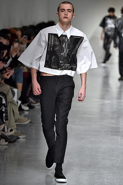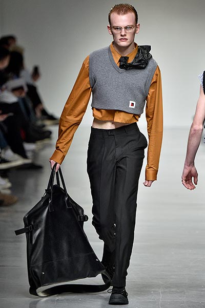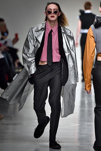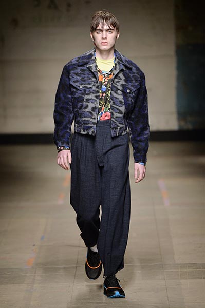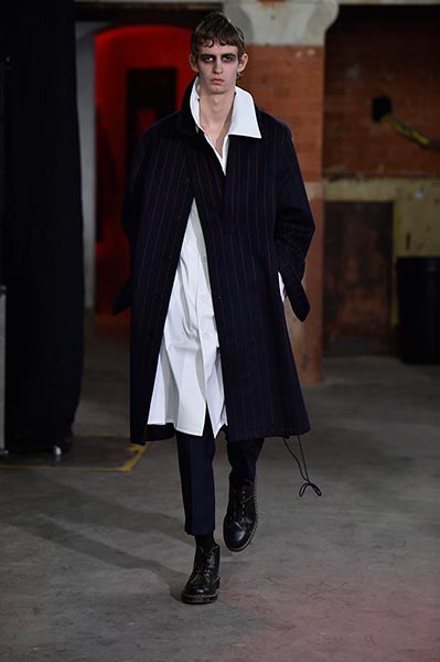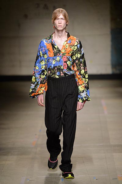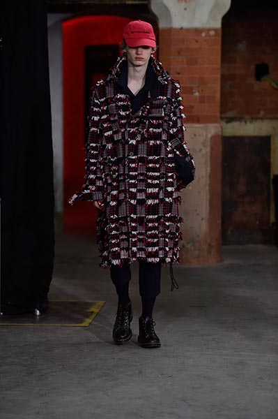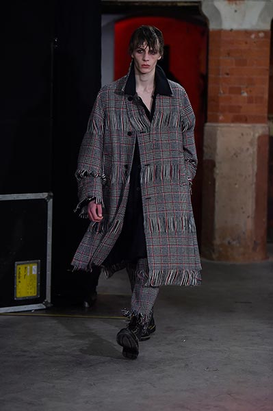 Like many designers showing in London this season, Topman Design sought to explore and celebrate archetypal ideas of Britain, with many reports pointing to the artistic community’s interest in what a post-Brexit world looks like. Topman Design, the big-name British retailer’s high-end fashion line, homed in on the aesthetic of nomadic travellers and dock and canal workers, with mismatched wool tailoring paired with hand-painted floral prints in utilitarian shapes drawn from military and workwear history, such as cuffed finishes and baggy cuts. Highlights included pleat-front chalk-stripe grey wool trousers and an oversized plaid coat, with the collection setting the mood for the days to come.
