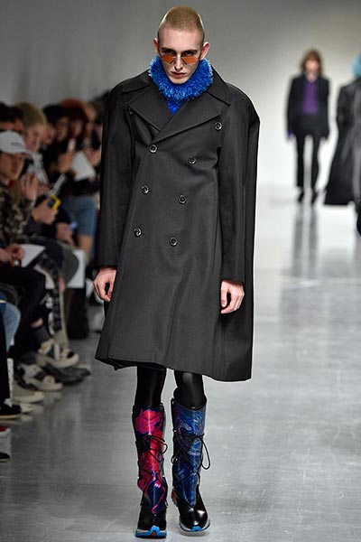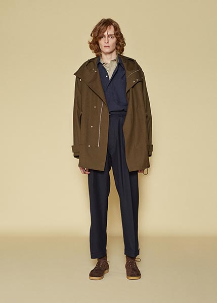 Chinese designer Xander Zhou has a way of taking the most traditional of menswear items – a button-down shirt and trousers, for instance – and thwarting its look so radically as to completely reinvent it, imbuing his collections with an artistic tension about which a thesis could be written. Through his work, Zhou creates a new identity for Chinese youth; having grown up looking at the rest of the world, the rest of the world now looks to China and the innovation it as a country proposes. For fall/winter 2017, Zhou’s collection has a sense of the futuristic – what he describes as “techno-orientalism” – in the way he shrinks v-neck sweaters but explodes shirting, or renders trench coats in metallic fabrics, or adds flare to Maoist-style military coats. Wool featured prominently in Zhou’s collection, such as in trousers and outerwear.