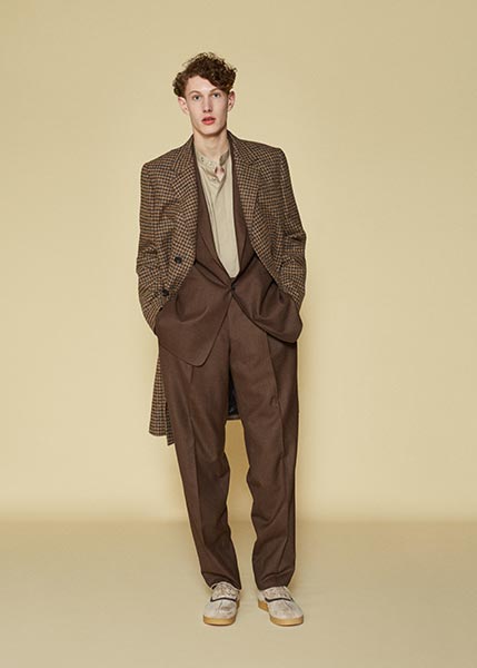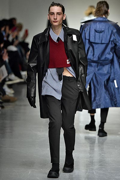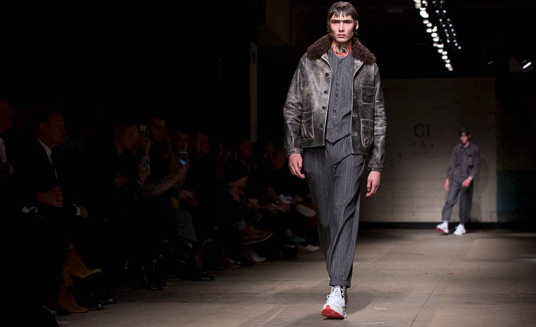 At E. Tautz, designer Patrick Grant similarly tapped into British subculture, but looked instead to the landscape documentary photography of Peter Mitchell. A prolific photographer of countryside scarecrows (his oeuvre comprises some 40 years of images), Mitchell’s images depict somewhat disfigured, strewn together forms, and while the fall/winter 2017 collection of E. Tautz was altogether more polished, it nonetheless showcased a quixotic mix of styles and proportions, all tinged in that sepia-toned palette of the photographer. Baggy trousers tapered at the ankles, double-breasted jackets were cut loose from the body, knitted wool sweaters featured crew-necks and wide armholes, and the colours ran the gamut from grey to green with brown, amber and navy in between.