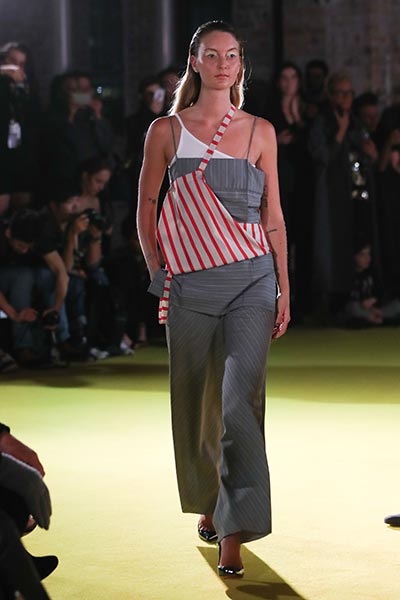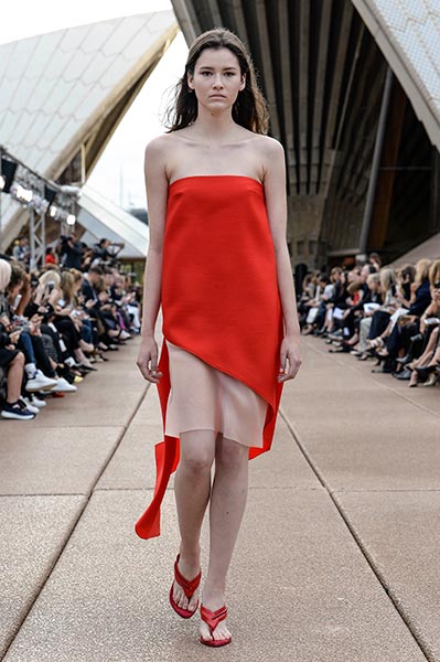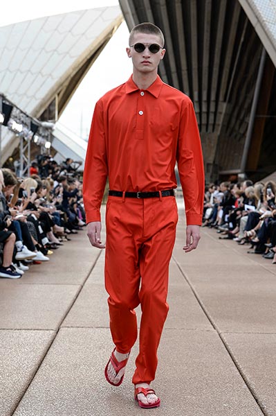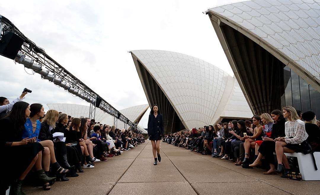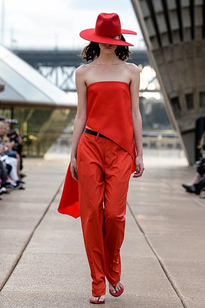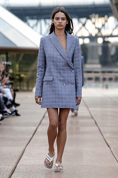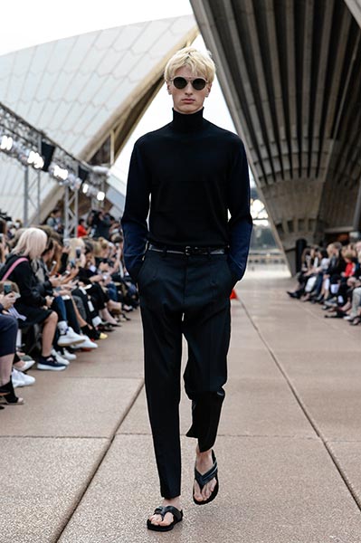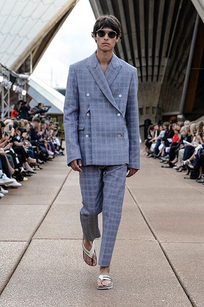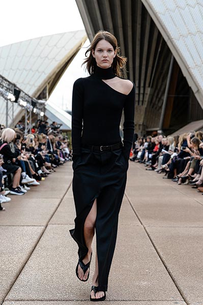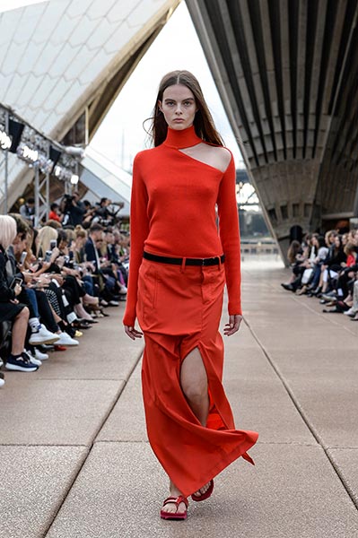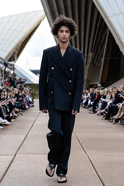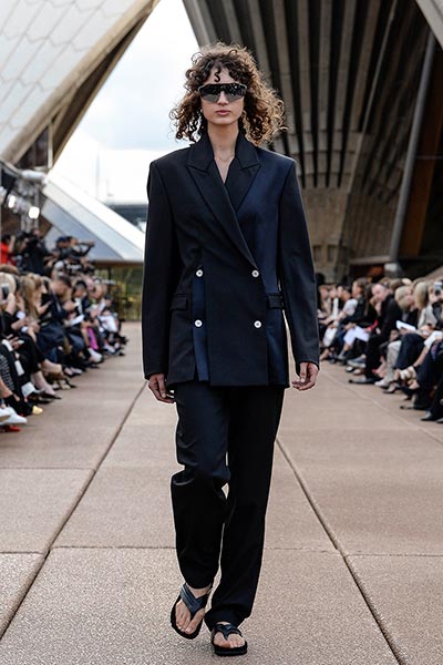 Sydney-born, New York-based designer Dion Lee returned home to open this year’s event, staging a show at no less than the city’s most iconic venue, the Sydney Opera House, beneath the sculptural sails of Jørn Utzon’s architectural masterpiece. Lee has taken inspiration from the building before, most notably in his International Woolmark Prize capsule collection, for which he competed as a finalist representing Australia back in 2013, and it continues to inform the way he so cleverly slices cuts and applies cloth to the body. Innovations in this gender-neutral collection could be seen in the way double-breasted blazers featured multiple layers of fine Merino wool fabric, parting to reveal glimpses of the body, or that ribbed wool sweaters comprised cut-out panels, giving them a sportswear edge that’s in tune with the way we live today.