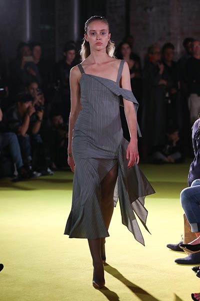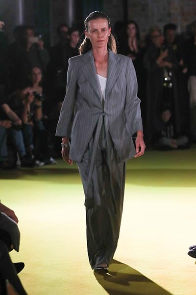 Another former International Woolmark Prize finalist, Christopher Esber, continued his design relationship with wool, too. For his resort collection, Esber continued to explore elements of traditional men’s tailoring for the female body, but subverted the classicism of the garments with cuts that dissected the fabric, resulting in splits, ruching and asymmetrical fits. A highlight included Merino wool suiting, here worn by Australian supermodel Emma Balfour, that tied rather than buttoned at the front.