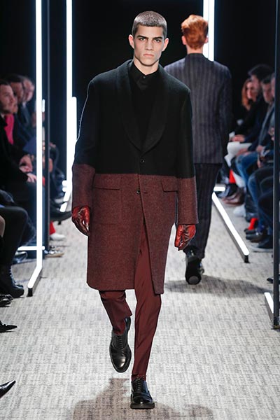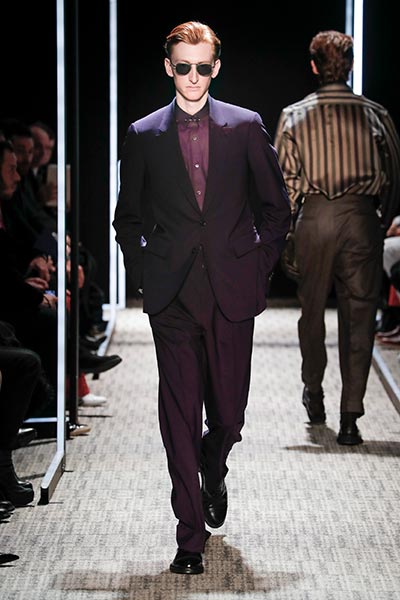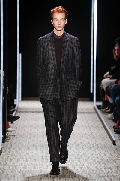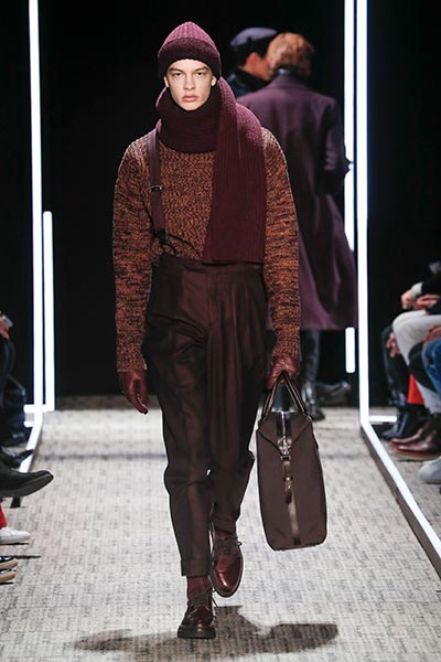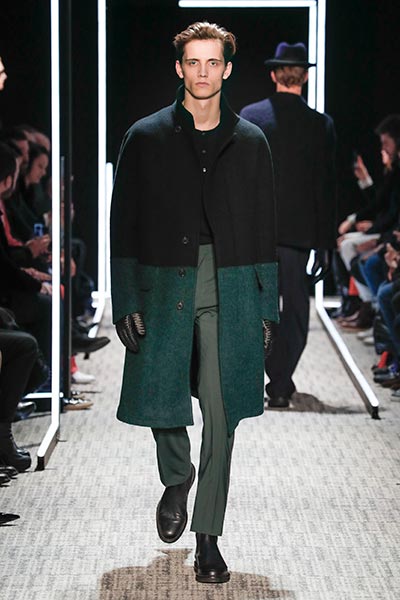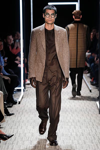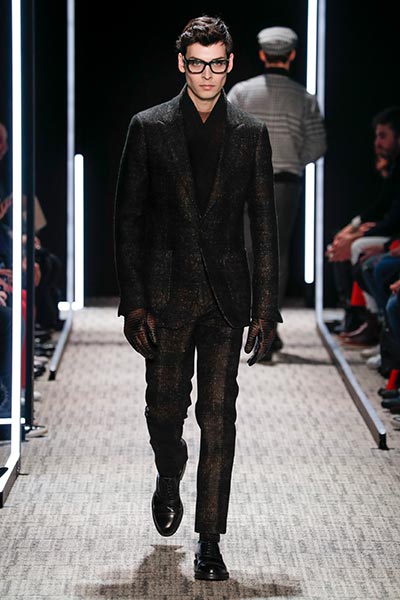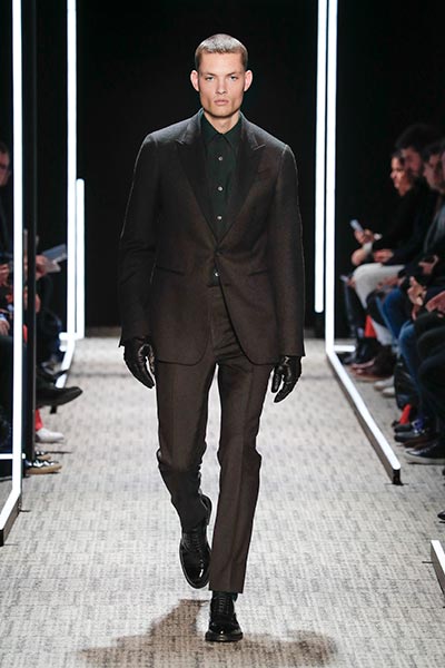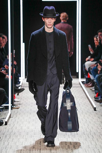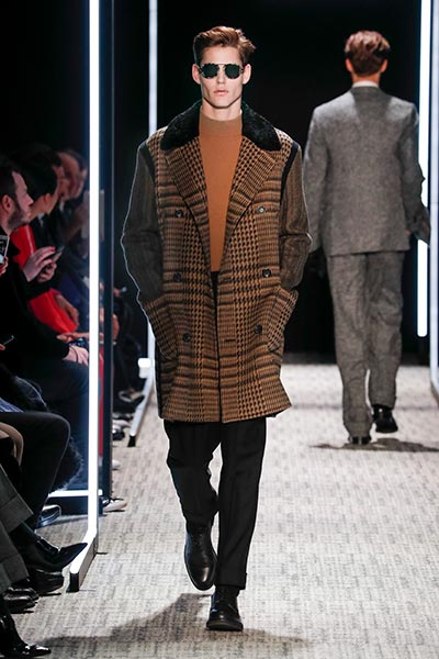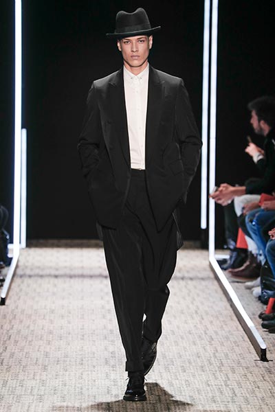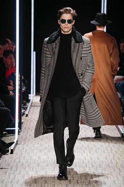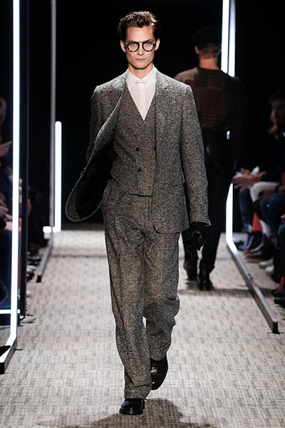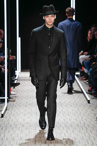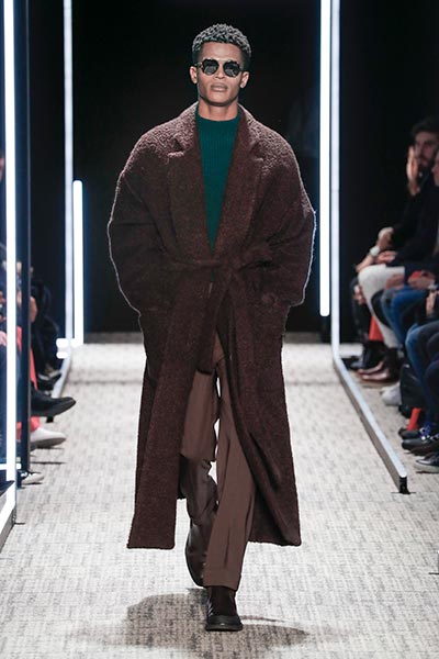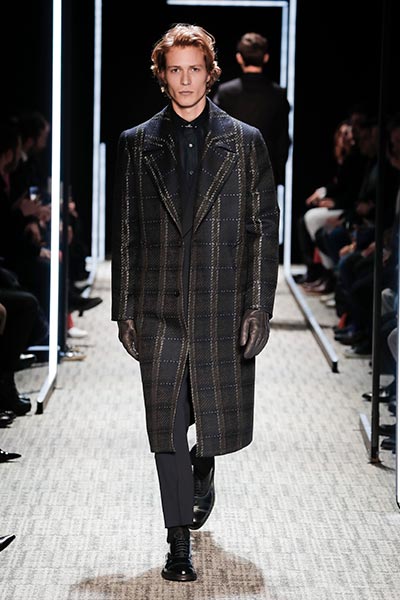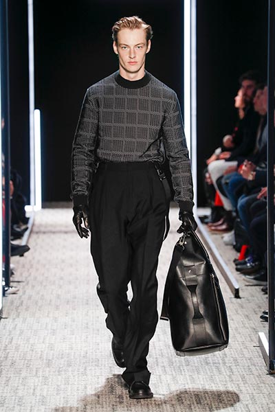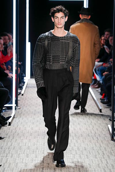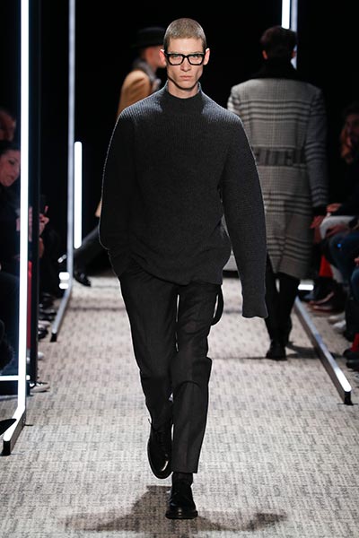 Cerruti’s status as a go-to outfitter for the world’s most stylish. In a colour palette predominantly of black, grey and camel – with hints of rich tones, such as bottle green, purple and burgundy – the collection showcased a slightly languid, 1940s silhouette, with a relaxed soft shoulder, longer jacket length and high-waisted trouser. Highlights included pleat-front trousers, round-neck knitwear, belted overcoats and double-breasted pinstripe suiting. In terms of fabrics, texture was key, making the show’s audience want to reach out to touch the garments as they came down the runway. These included checked jacquard, shearling, wool Prince-of-Wales check and innovative weaves.