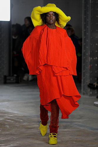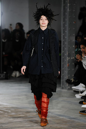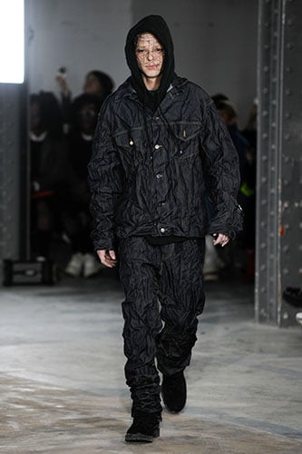 Unique wrinkle-effect wool-denim pieces, wool-fur jackets and a vivid red dress made of light-weight wool tropical closed the show were particular highlights of a very strong and coherent collection along with the designer's signature layers and big silhouettes.